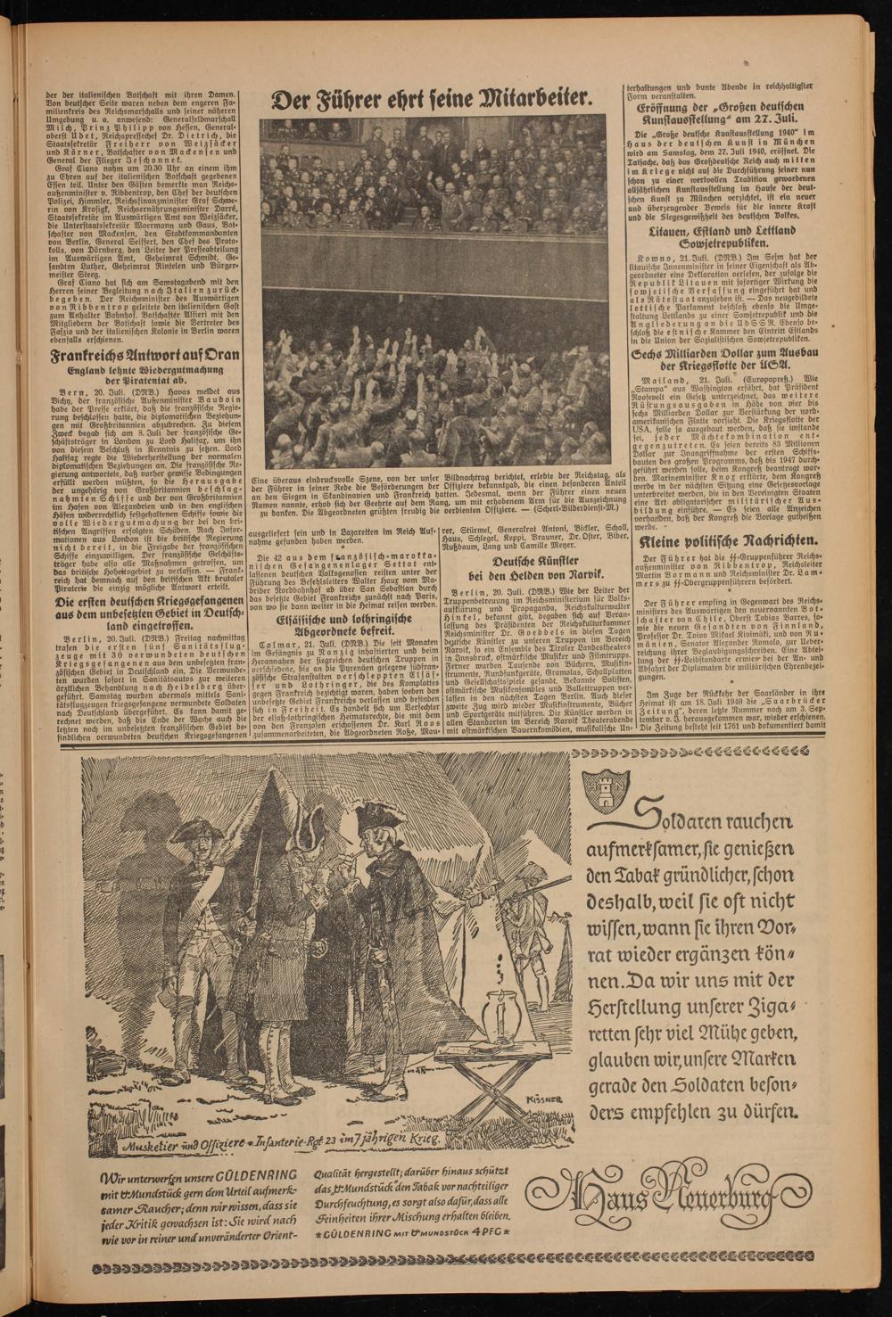 Im Zuge der Rückkehr der Saarländer in ihre Heimat ist am 18. Juli 1940 die „Saarbrücker Zeitun g", deren letzte Nummer noch am 3. September v. I. herausgekommen war, wieder erschienen. Die Zeitung besteht seit 4761 und dokumentiert damit
