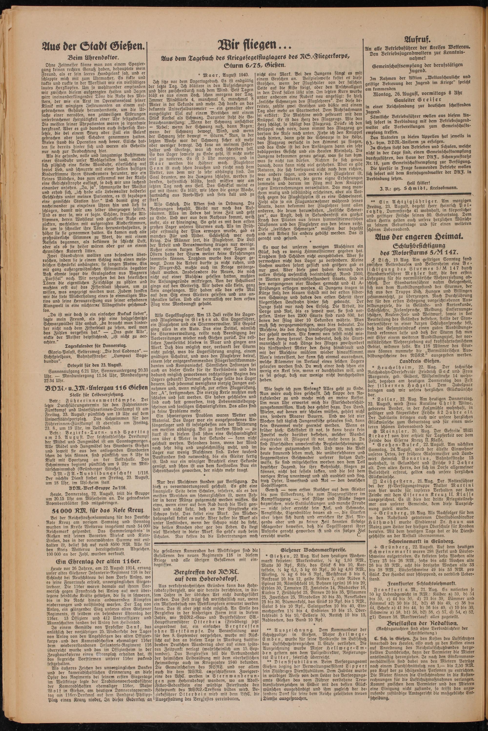heute vor 26 Jahren, am 22. August 1914, errang unser altes Gießener Infanterie-Regiment 116 in der Schlacht bei Neufchäteau bei dem Dorfe Anloy, wo es feine Feuertaufe erhielt, unvergänglichen Sieaes- lorbeer. Die 116er waren damals auf ihrem Vormarsch gegen Frankreich bei Anloy auf weit Überlegene feindliche Kräfte gestoßen, die in schweren, bis in die Nacht hinein andauernden Kämpfen niederrangen und vollständig warfen. Der Tag von Anloy, ein glänzender Sieg unseres alten Gießener Regiments, ist seitdem ein besonderer Ehrentag der 116er. 13 Offiziere und 412 Unteroffiziere und Mannschaften fanden bei Anloy den Heldentod.