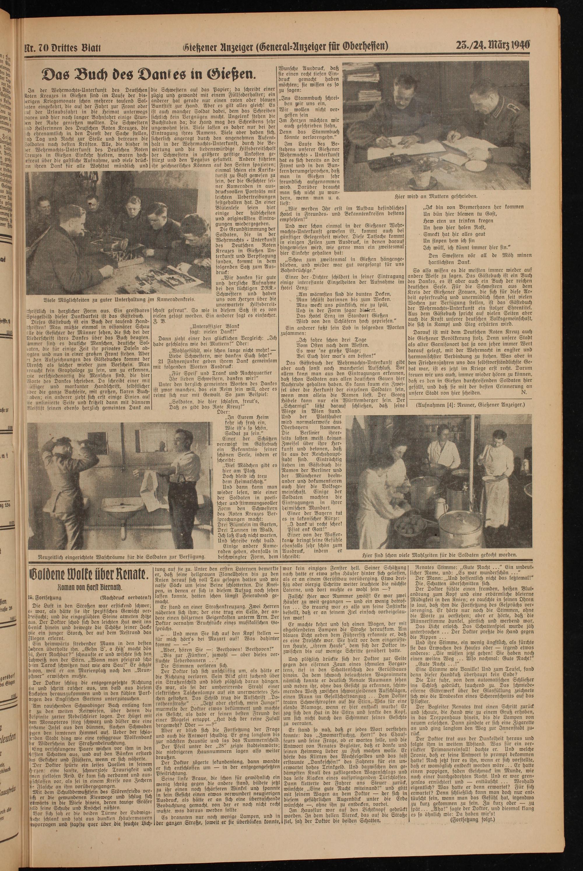 deutschen Seele. Für die Schwestern aus dem Kreis der Gießener Frauen, die sich für diese Arbeit opferfreudig und unermüdlich schon seit vielen Wochen zur Verfügung stellen, ist das Gästebuch der Wehrmachts-Unterkunft ein stolzer Ehrentitel. Aus dem Gästebuch spricht auf vielen Seiten aber auch die Kraft unserer deutschen Volksgemeinschaft, die sich in Kampf und Sieg erhärten wird.