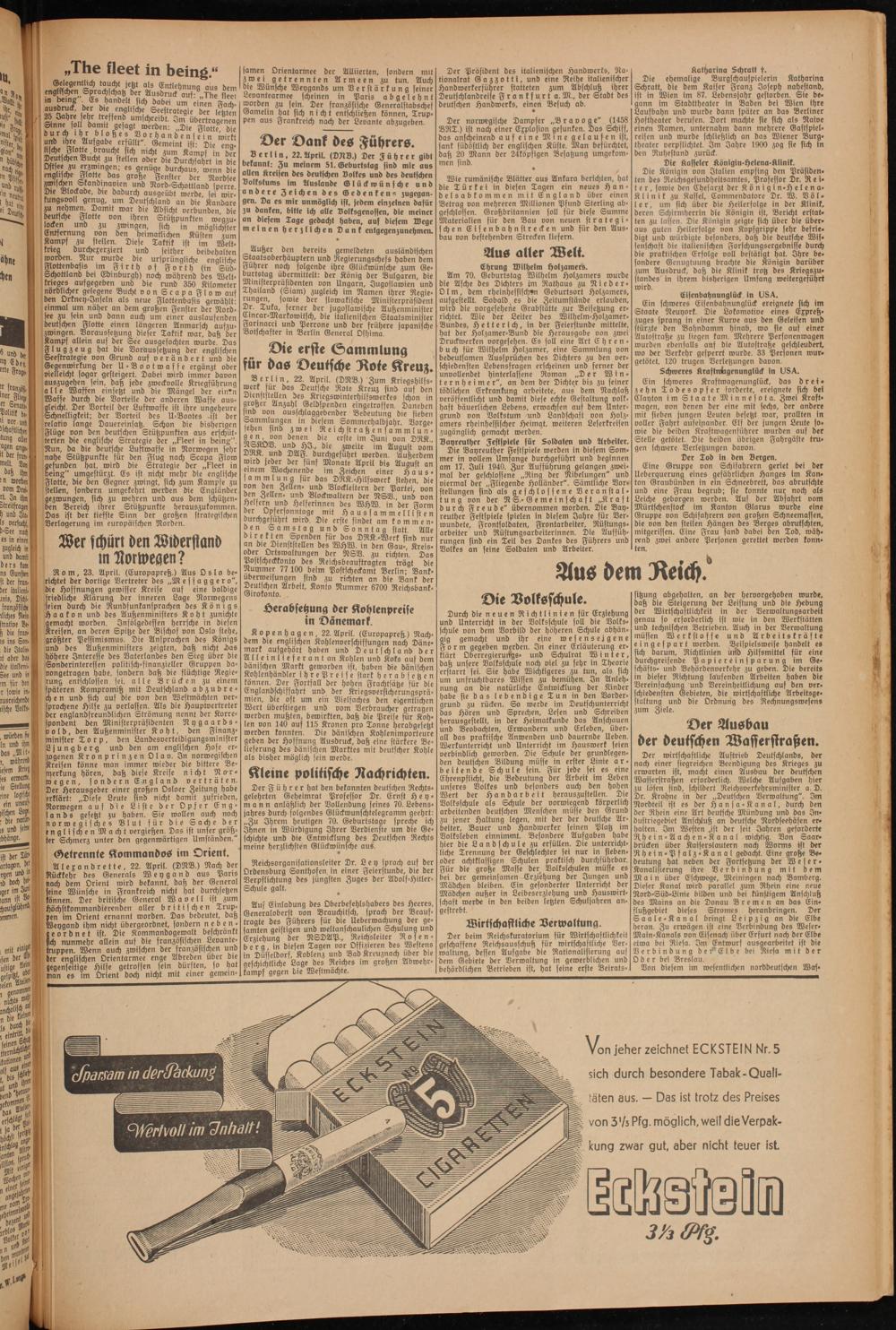 Rom, 23. April. (Europapreß.) Aus Oslo berichtet der dortige Vertreter des „M e s s a g g e r o", die Hoffnungen gewisser Kreise auf eine baldige friedliche Klärung der inneren Lage Norwegens | seien durch die Rundfunkansprachen des Königs Haakon und des Außenministers Koht zunickte ! gemacht worden. Infolgedessen herrsche in diesen Kreisen, an deren Spitze der Bischof von Oslo stehe, | größter Pessimismus. Die Ansprachen des Königs \ und des Außenministers zeigten, daß nicht t>as , höhere Interesse des Vaterlandes den Sieg über die I Sonderinteressen politisch-finanzieller Gruppen davongetragen habe, sondern daß die flüchtige Regierung entschlossen sei, alle Brücken zu einem späteren Kompromiß mit Deutschland abzubre - ; ch e n und sich auf die von den Westmächten versprochene Hilfe zu verlassen. Als die Hauptvertreter der englandfreundlichen Strömung nennt der Korrespondent den Ministerpräsidenten Nygaards- o old, den Außenminister Koht, den Finanz- ■ Minister Torp, den Landesverteidigungsminister Ljungberg und den am englischen Hofe erzogenen Kronprinzen Olav. In norwegischen Kreisen könne man immer wieder die bittere Be- merkung hören, daß diese Kreise nicht Nor- wegen, sondern England verträten. Der Herausgeber einer großen Osloer Zeitung habe erklärt: „Diese Leute sind nicht damit zufrieden, ; Norwegen a u f d i e Liste der Opfer Englands gesetzt zu haben. Sie wollen auch noch norwegisches Blut für die Sache der englischen Macht vergießen. Das ist unser größter Schmerz unter den gegenwärtigen Umständen."