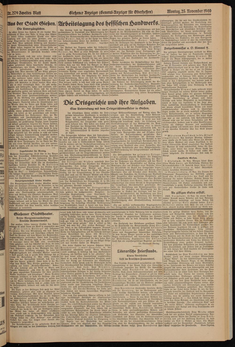 Frau Nordstrom überbrachte ihrerseits Grüße von Dr. Henning, der im Vorttagsamt zahlreiche deutsche Schriftsteller betreue, und begrüßte insbesondere den Kreisleiter und die Kreisfrauen- schaftsletterin. — Bevor sie aus ihren Büchern las, legte sie ein begeistertes Bekenntnis zu Deutschland, zum Nationalsozialismus und zum Führer ab: sie glaube an die rassisch und kulturell begründete Verbundenheit zwischen dem deutschen upö dem schwedischen Volke, grau, Nordstrom schilderte dann, in locker aneinandergereihten Bildern und Gedanken, mit allerlei persönlichen- Erinnerungen und Eindrücken, den Charakter der schwedischen Landschaft und Kultur und die Volkstumseigenart des schwedischen Menschen. Das schwedische Volk erscheine ihr als der träumerisch-unerfahrene Jüngling ohne die Kampferprobung, die der größere deutsche Bruder besitzt. Frau Nordstrom schll-