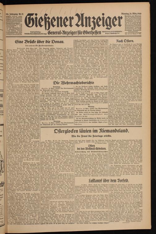 ...... 26. März. (P.K.) Durch den strahlenden Himmel des Ostersonntagnachmittags fliegen Messerschmitt-Maschinen Grenzüberwachung. Tief unten ziehen sich die Gräben des Vorfeldes, hier die deutschen, drüben die feindlichen. Keine Bewegung ist zu erkennen. In Ruhe liegen sich die Fronten gegenüber.