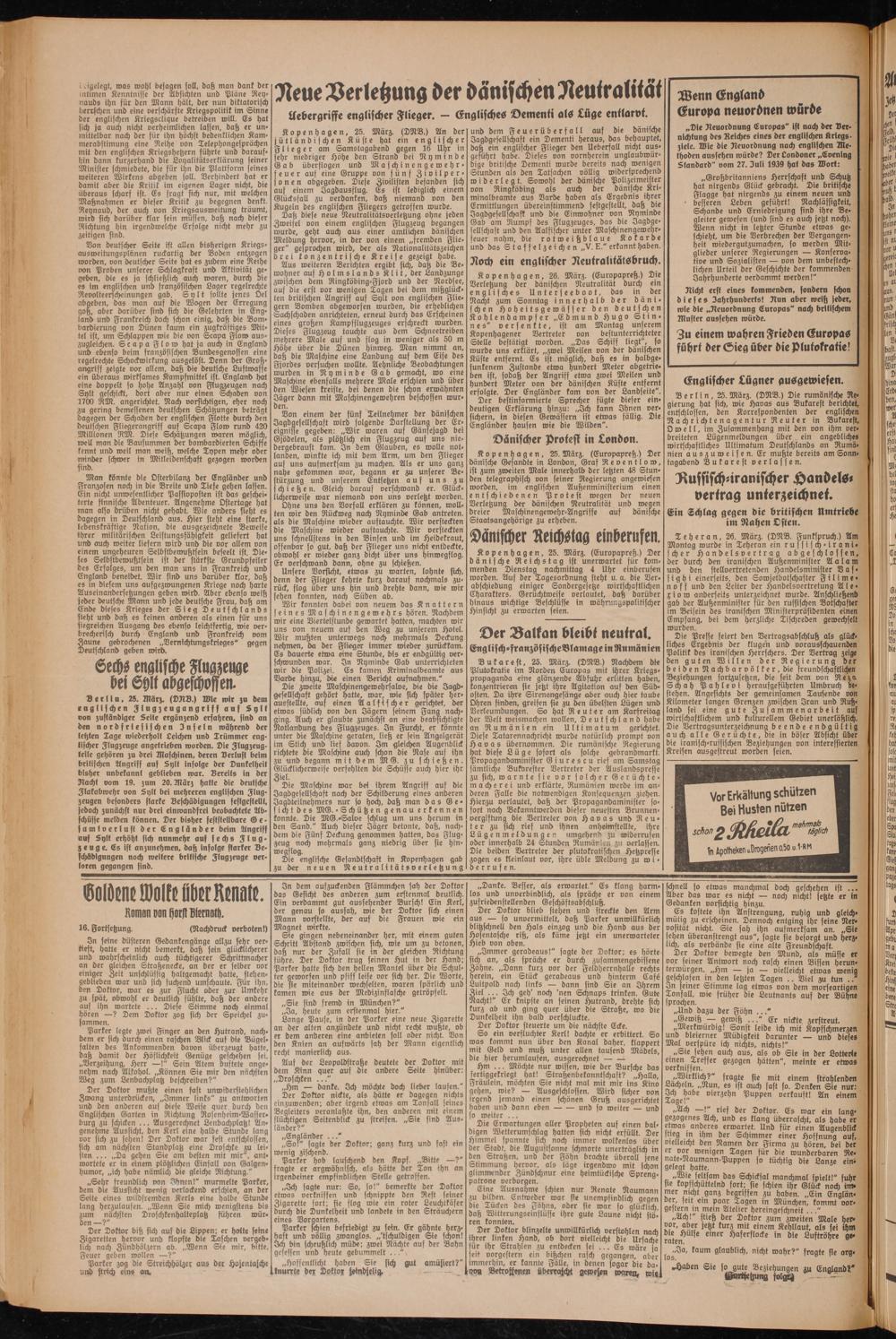 Von deutscher Seite ist allen bisherigen Kriegsausweitungsplänen ruckartig der Boden entzogen worden, von deutscher Seite hat es zudem eine Reihe von Proben unserer Schlagkraft und Aktivität gegeben, die es ja schließlich auch waren, durch die es im englischen und französischen Lager regelrechte Revolte ersehe inungen gab. Sylt sollte jenes Del abgeben, das man auf die Wogen der Erregung goß, aber darüber find sich die Gelehrten in England und Frankreich doch schon einig, daß die Bombardierung von Dünen kaum ein zugkräftiges Mittel ist, um Schlappen wie die von Scapa Flow auszugleichen. Scapa Flow hat ja auch in England und ebenso beim französischen Bundesgenossen eine regelrechte Schockwirkung ausgelöst. Denn der Großangriff zeigte vor allem, daß die deutsche Luftwaffe ein überaus wirksames Kampfmittel ist. England hat eine doppelt so Hohe Anzahl von Flugzeugen nach Sylt geschickt, dort aber nur einen Schaden von 1700 RM. angerichtet. Nach vorsichtigen, eher noch zu gering bemessenen deutschen Schätzungen beträgt dagegen der Schaden der englischen Flotte durch den deutschen Fliegerangriff auf Scapa Flow rund 420 Millionen RM. Diese Schätzungen waren möglich, well man die Bausummen der bombardierten Schiffe kennt und weil man weiß, welche Typen mehr oder minder schwer in Mitleidenschaft gezogen worden sind.