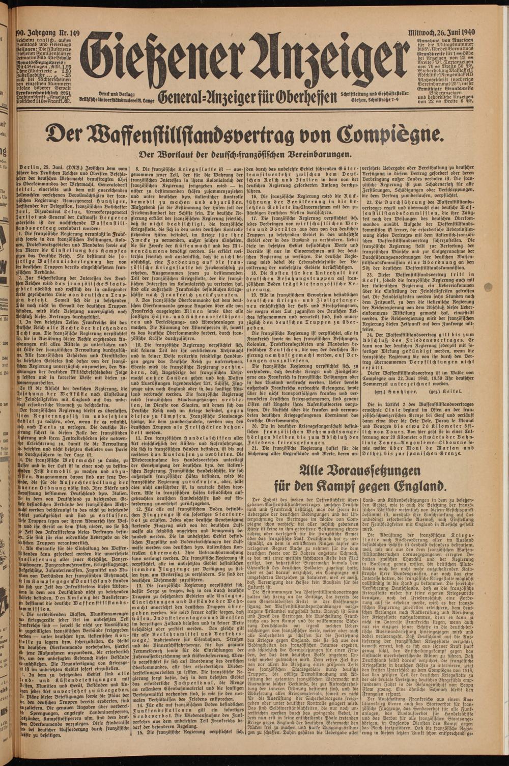 Dieser Wcrffenstiltftandsvertrag ist im Walde von Lompiegne am 22. 3uni 1940, 18.50 Hhr deutscher Sommerzeit unterzeichnet worden.