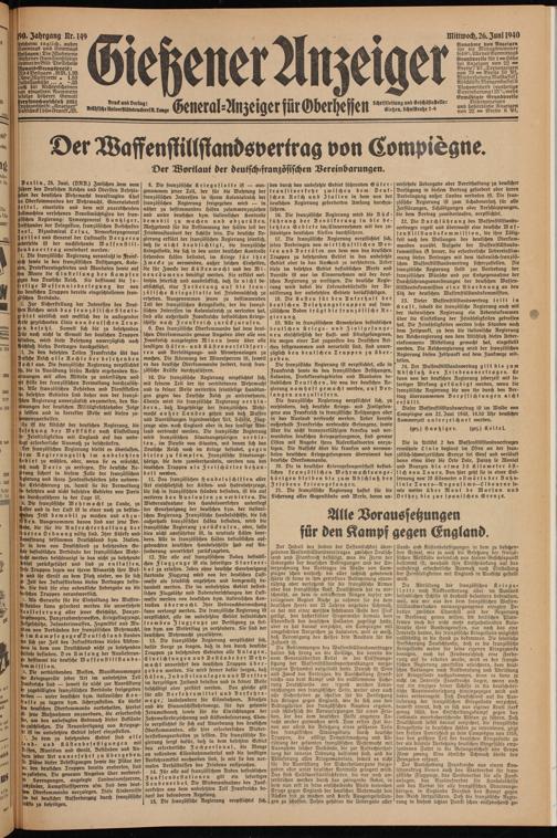 Der Inhalt des soeben der Öffentlichkeit übergebenen Waffenstillstandsoertrages zwischen Deutschland und Frankreich 'bestätigt, was die Form der lieber gäbe der beutschen Bedingungen und der Unterzeichnung des Vertrages im Walde von Corn- piegne schon verhieß: bei aller sachlich gebotenen Härte ist keine in ihm getroffene Bestimmung ehrenrührig oder verletzend für die französische Armee oder das französische Volk. Deutschland hat es verschmäht, an dem in erbittertem Ringen tapfer unterlegenen Gegner Rache zu nehmen für die dem deutschen Heere vor 22 Fahren angetane Schmach, es hat mit einer weithin sichtbaren Geste den Fleck getilgt, den haßerfüllter Siegerwahn damals dem Ehrenkleid des deutschen Soldaten zugefügt hatte, aber es hat darauf verzichtet, ein Compiegne mit umgekehrten Vorzeichen zu statuieren, weil es weiß, daß Verewigung des Hasses kein Baustein für die Zukunft ist.