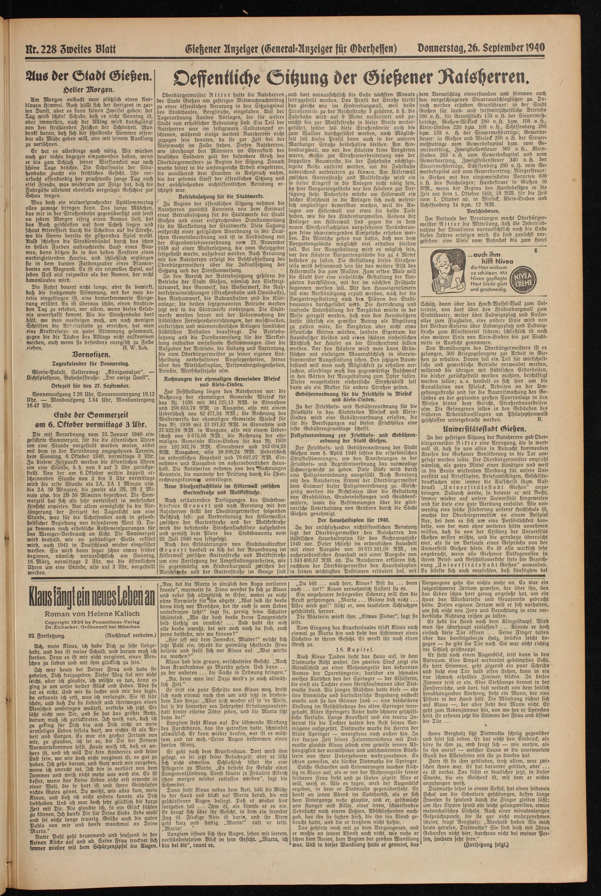 In der anschließenden nichtöffentlichen Beratung legt der Oberbürgermeister den Ratsherren den städtischen Haushaltsplan für das Rechnungsjahr 1940 vor. Dieser schließt im ordentlichen Haushalt mit einer Ausgabe von 10 875161,09 RM., im außerordentlichen Haushalt mit einer Ausgabe von 1343 466,67 RM. ab. Die Ratsherren erklären sich, nachdem der Oberbürgermeister den Haushaltsplan in feinen wichtigsten Positionen erläutert hak, mit