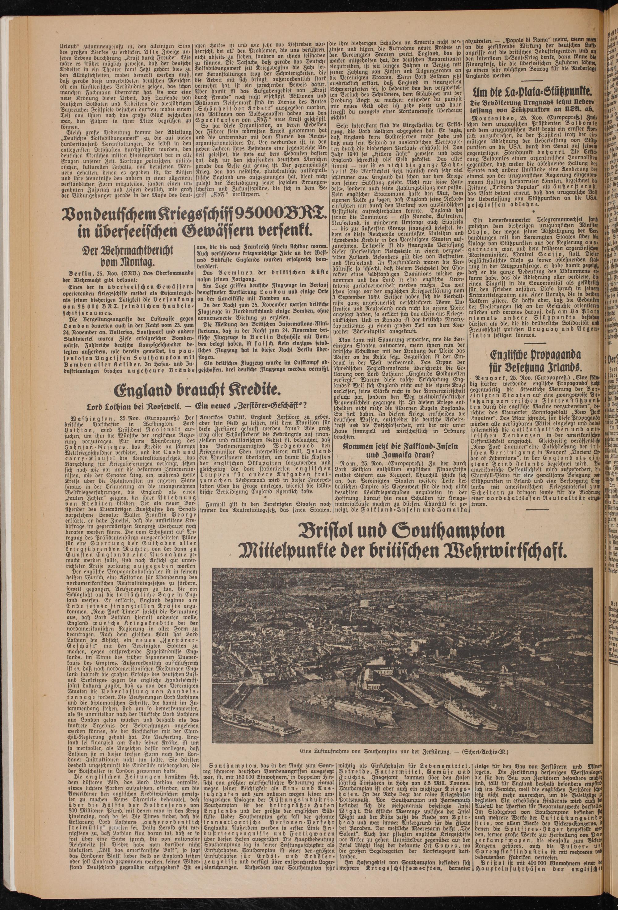 Rom, 25. Nov. (Europapreß.) Zu der durch Lord Lothian enthüllten englischen Finanzkrisis meldet Stefani aus Neuyork, Churchill schicke sich an, den Vereinigten Staaten weitere Teile des britischen Empire als Gegenwert für die noch nicht bezahlten Wettkriegsschulden anzubieten in der Hoffnung, darauf hin neue Schulden für Kriegsmaterialkäufe machen zu dürfen. Churchill sei geneigt, die Falkland-Inseln und Jamaika