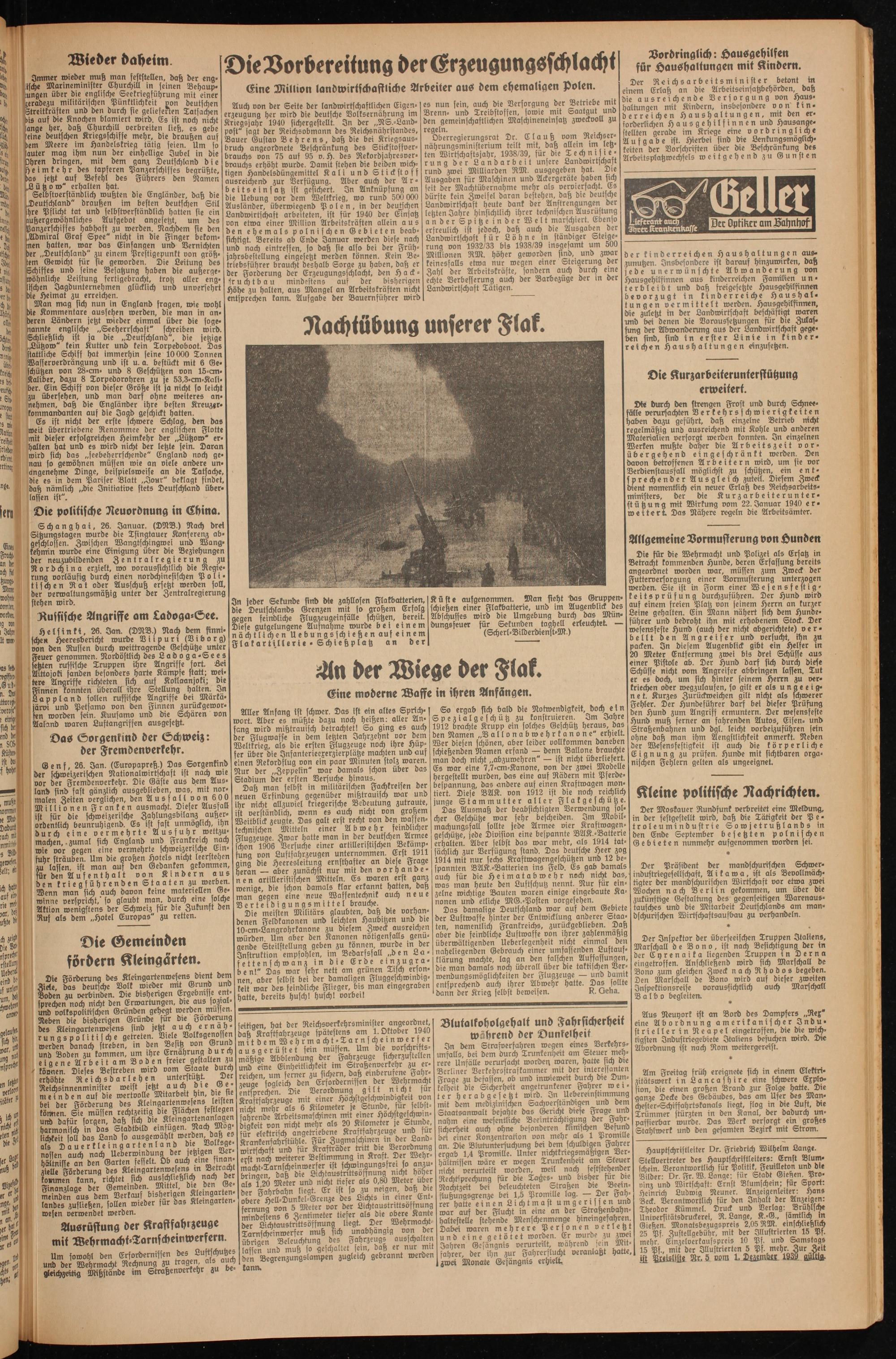 Hauptschriftleiter Dr. Friedrich Wilhelm Lange. Stellvertreter des Hauptschriftleiters: Emst Blumschein. Verantwortlich für Politik, Feuilleton und die Bilder: Dr. Fr. W. Lange; für Stadt Gießen. Provinz und Wirtschaft: Ernst Blumschein; für Sport: Heinrich Ludwig Neuner. Anzeigenleiter: Hans Beck. Verantwortlich für den Inhalt der Anzeigen: Theodor Kümmel. Druck und Verlag: Bruhlfche Unioersitätsdruckerei, R. Lange, K.-G., sämtlich in Gießen. Monatsbezugspreis 2,05 RM. einschließlich 25 Pf. Zustellgebühr, mit der Illustrierten 15 Pf. mehr. Einzelverkaufspreis 10 Pf. und Samstags 15 Pf., mit der Illustrierten 5 Pf. mehr. Zur Zeit