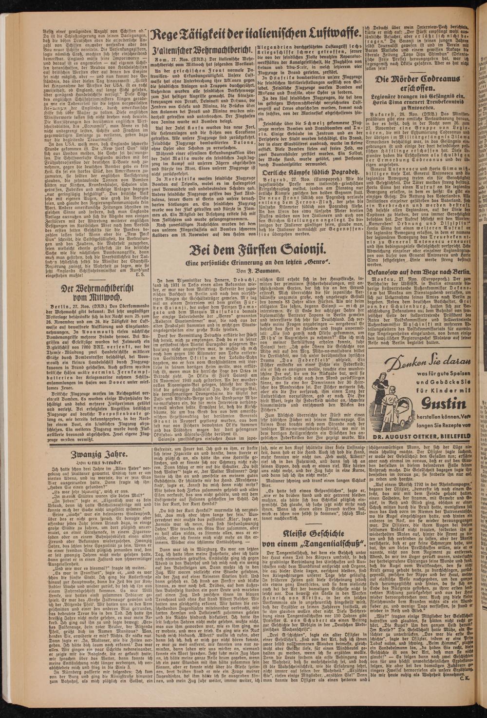 In Rordasrika warfen feindliche Flugzeuge Bomben auf Tripolis, wobei es im Hafengebiet zwei Verwundete und unbedeutenden Schaden gab. Andere feindliche Flugzeuge griffen das Fort Mad- dalena, ferner Garn ul Grein und unsere benachbarten Stellungen an. Liu feindliches Flugzeug wurde von der Flak getroffen und stürzte in Flammen ab. Lin Mitglied der Besatzung rettete sich mit dem Fallschirm und wurde gefangengenommen.