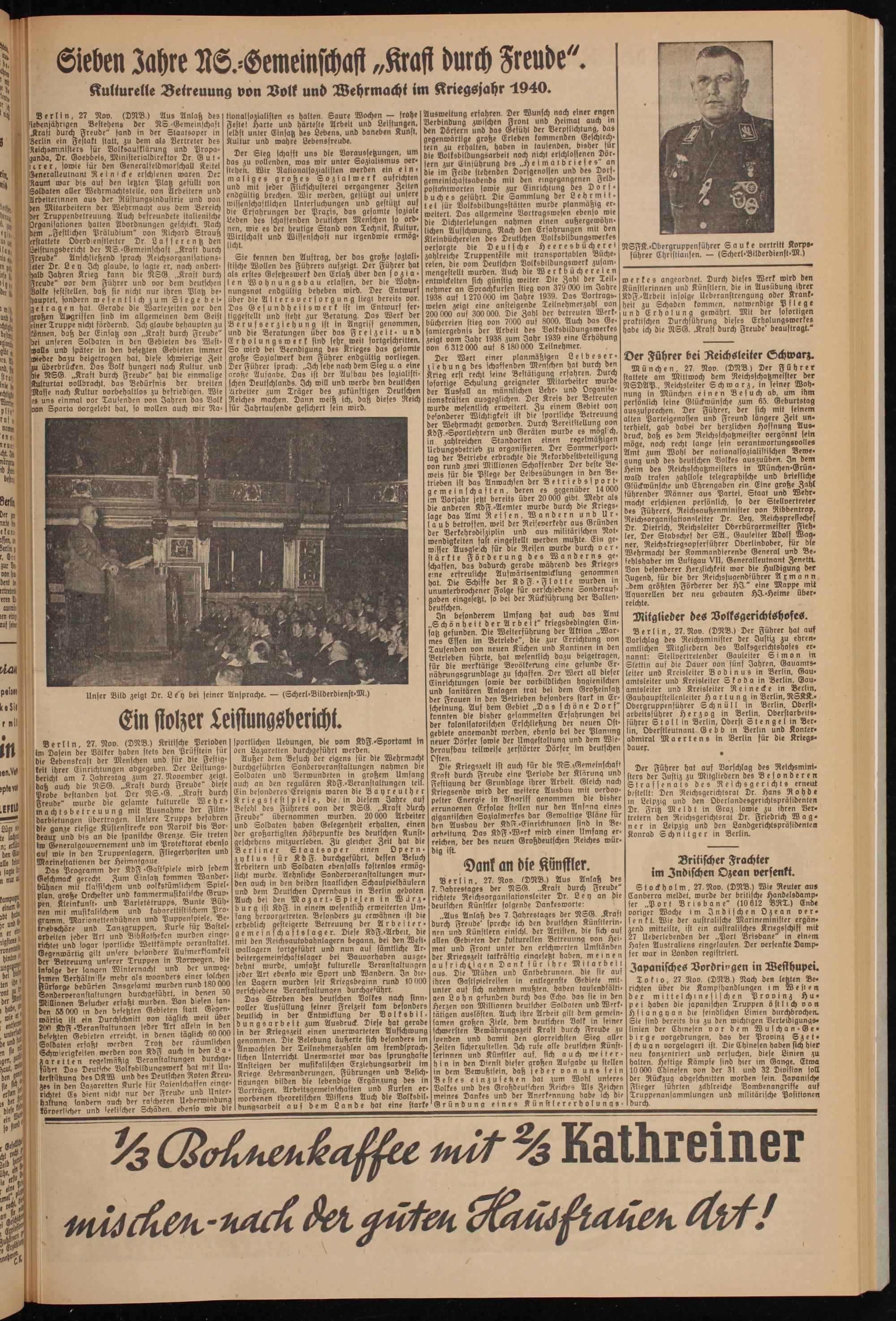 Berlin, 27. Nov. (DNB.) Kritische Perioden im Dasein der Völker Haden stets den Prüfstein für bie Lebenskraft der Menschen unb für die Festigkeit ihrer Einrichtungen abgegeben. Der Leistungsbericht am 7. Jahrestag zum 27. November zeigt, daß auch bie NSG. „Kraft burch Freube" biefe Probe bestanden hat Der NS.-G. „Kraft durch Freude" wurde die gesamte kulturelle Wehrmachtsbetreuung mit Ausnahme der Filmbarbietungen übertragen. Unsere Trupps befahren bie ganze riesige Küstenstrecke von Narvik bis Bordeaux und bis an die spanische Grenze. Sie treten im Generalgouvernement und im Protektorat ebenso auf wie in den Truppenlagern, Fliegerhorsten und Marinestationen der Heimatgaue.
