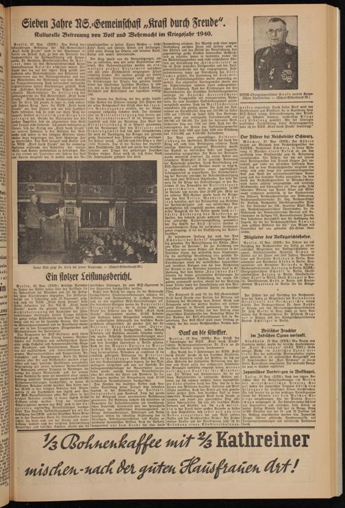 ?i unseren Soldaten in den Gebieten des Westwalls und später in den besetzten Gebieten immer lieber dazu beize tragen hat, diese schwierige Zeit 1 überbrücken. Das Volk hungert nach Kultur, und ie NSG »Kraft durch Freude" hat die einmalige Ülturtat vollbracht, das Bedürfnis der breiten