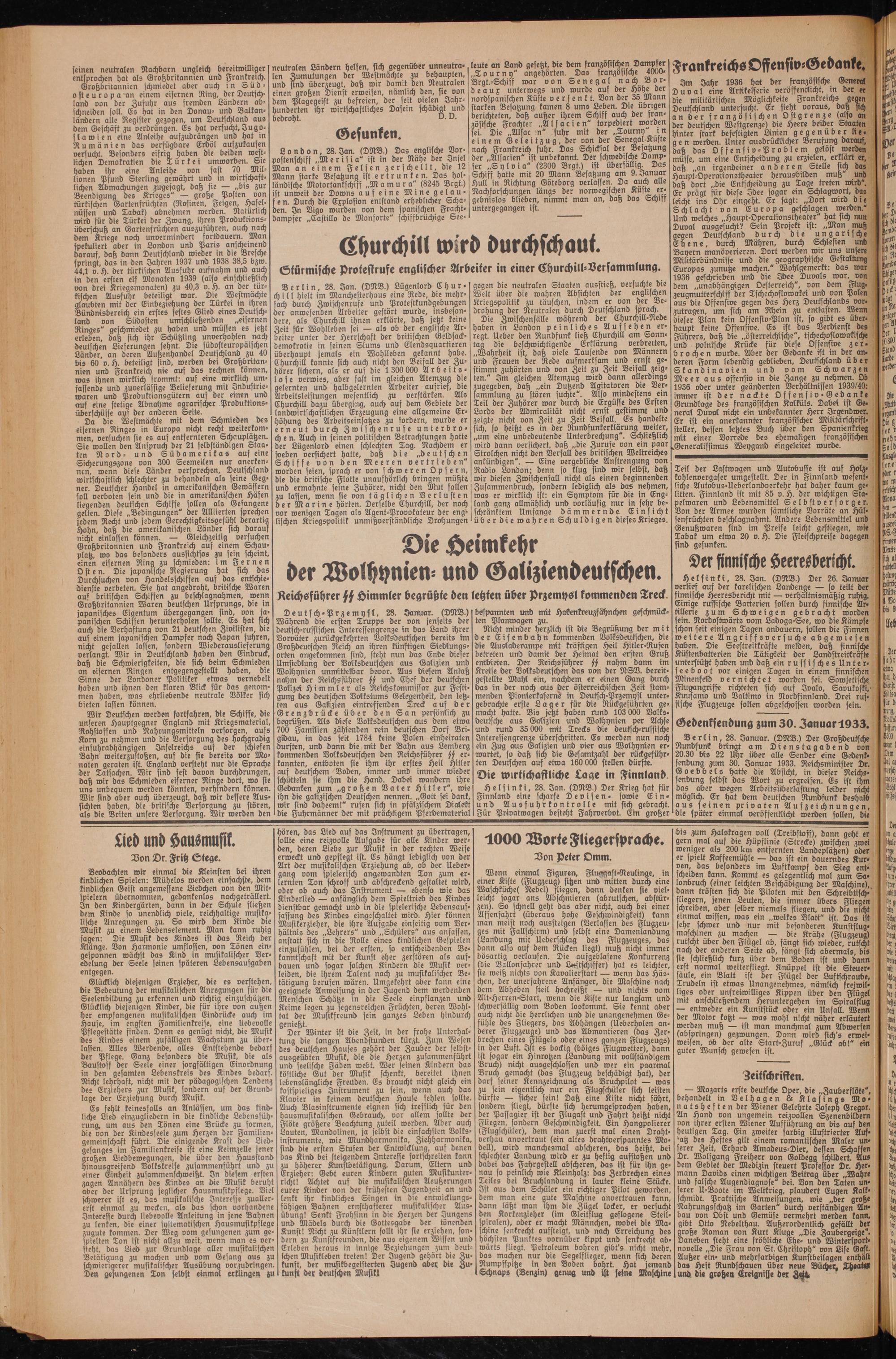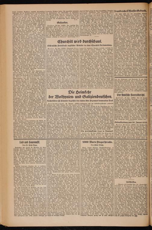 Die Zwischenfälle während der Churchill-Rede haben in London peinliches Aufsehen erregt. lieber den Rundfunk ließ Churchill am Sonntag die beschwichtigende Erklärung verbreiten, „Wahrheit ist, daß viele Tausende von Männern und Frauen der Rede aufmerksam und ernst gestimmt zuhörten und von Zeit zu Zeit Beifall zeigten." Im gleichen Atemzug wird dann allerdings zugegeben, daß „ein Dutzend Agitatoren die Versammlung zu stören suchte". Also mindestens ein Teil der Zuhörer war durch die Ergüsse des Ersten Lords der Admiralität nicht ernst gestimmt und zeigte nicht von Zeit zu Zeit Beifall. Es handelte sich, so heißt es in der Rundfunkerklärung weiter, „um eine unbedeutende Unterbrechung". Schließlich wird dann versichert, daß „die Zurufe von ein paar Strolchen nicht den Perfall des britischen Weltreiches ankündigen". — Eine vergebliche Anstrengung von Radio London: denn so klug sind wir selbst, daß mir diesen Zwischenfall nicht als einen beginnenden ! Zusammenbruch, sondern lediglich als das nehmen, was er wirklich ist: ein Symptom für die in England ganz allmählich und vorläufig nur in sehr beschränktem Umfange dämmernde Einsicht überdie wahren Schuldigen dieses Krieges.