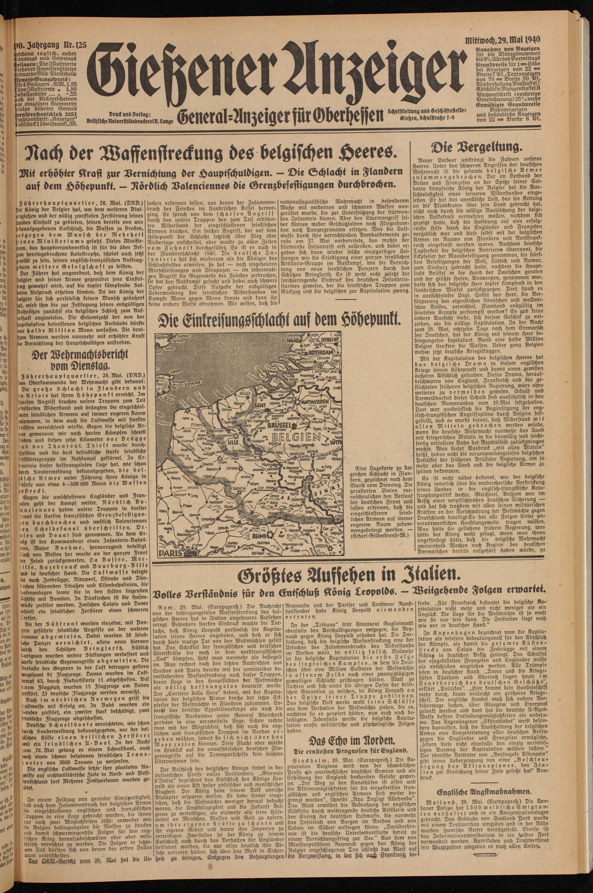 Neuer Lorbeer umkränzt bie Fahnen unsres Heeres. Unter ben schweren Angriffen ber beutschen Wehrmacht ist bie gesamte belgische Armee zusammengebrochen. Der im Verbanb bec Briten unb Franzosen an ber Spitze seiner Sol- baten kämpfenbe König ber Belgier hat bie Aus- sichtslosigkeit eines ferneren Wiberstanbes eingesehen. Er hat bas unenbliche Leib, bas bie Kettung an bie6 Plutokraten über fein Lanb gebracht hat, nicht noch burch bie völlige Auslöschung ber belgischen Volkskraft vermehren wollen, nachbem sich gezeigt hatte, baß bie Hoffnung auf eine erfolgreiche Hilfe burch bie Englänber unb Franzosen vergeblich war unb biese selbst mit ber belgischen Armee im Raume von Flanbern unb Norbfrank- reich eingekreist worben waren. Nachbem beutsche Tapferkeit bie belgischen Barrieren überrannt, bte Eckpfeiler ber Maasbefestigung genommen, bie stärksten Befestigungen ber Welt, Lüttich unb Namur, zum Einsturz gebracht hatte, nachbem bie Hauptstadt Brüssel in bie hanb ber Deutschen geraten unb ber größte Hafen, Antwerpen, genommen war, hatte sich bas belgische Heer tapfer kämpfenb in ben flanbrischen Winkel zurückgezogen. Dort stand es in aussichtsloser Lage. Sollte bas Heer, bie Verkörperung bes eigentlichen flämischen unb wallonischen Volkes, vernichtet, Flamlanb enbgülhg im sinnlosen Kampfe zerstampft werben? Es gab keine anbere Aussicht mehr, sich biesem Geschick du ent- ziehen, als bie völlige Kapitulation. In ber Nacht zum 28. Mai, achtzehn Tage nach bem Einmarsch ber Deutschen, hat ber König mit seinem Heer bedingungslos kapituliert. Rund eine halbe Million Belgier streckten bie Waffen, lieber ganz Belgien wehen jetzt beutsche Kriegsflaggen.