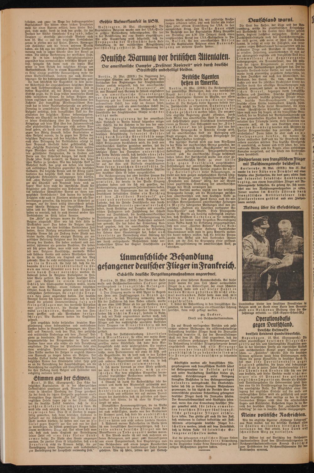 Ein typischer Vorfall wird aus dem Rio-Texas in der Nähe der mexikanischen Grenze gemeldet, wo am 22. Mai angeblich drei „Nazi-Agenten" mit dem Hakenkreuz gekennzeichnete Propagandaliteratur verteilt und die amerikanische Flagge beschimpft haben sollen. Der Zwischenfall wurde von einer gewissen amerikanischen Presie zu einer üblen Hetze gegen Deutschland ausgeschlachtet. Feststellungen der amerikanischen Nachrichtenagentur International News Service ergaben die völlige Haltlosigkeit dieser Behauptungen, es bleibt von dem ganzen aufgebauschten Vorfall lediglich ein Anhänger einer religiös-fanatischen Sekte „Propheten von Jehova" übrig, der auf Grund seiner pazifistischen Einstellung der amerikanischen Flagge den Gruß verweigert hat.