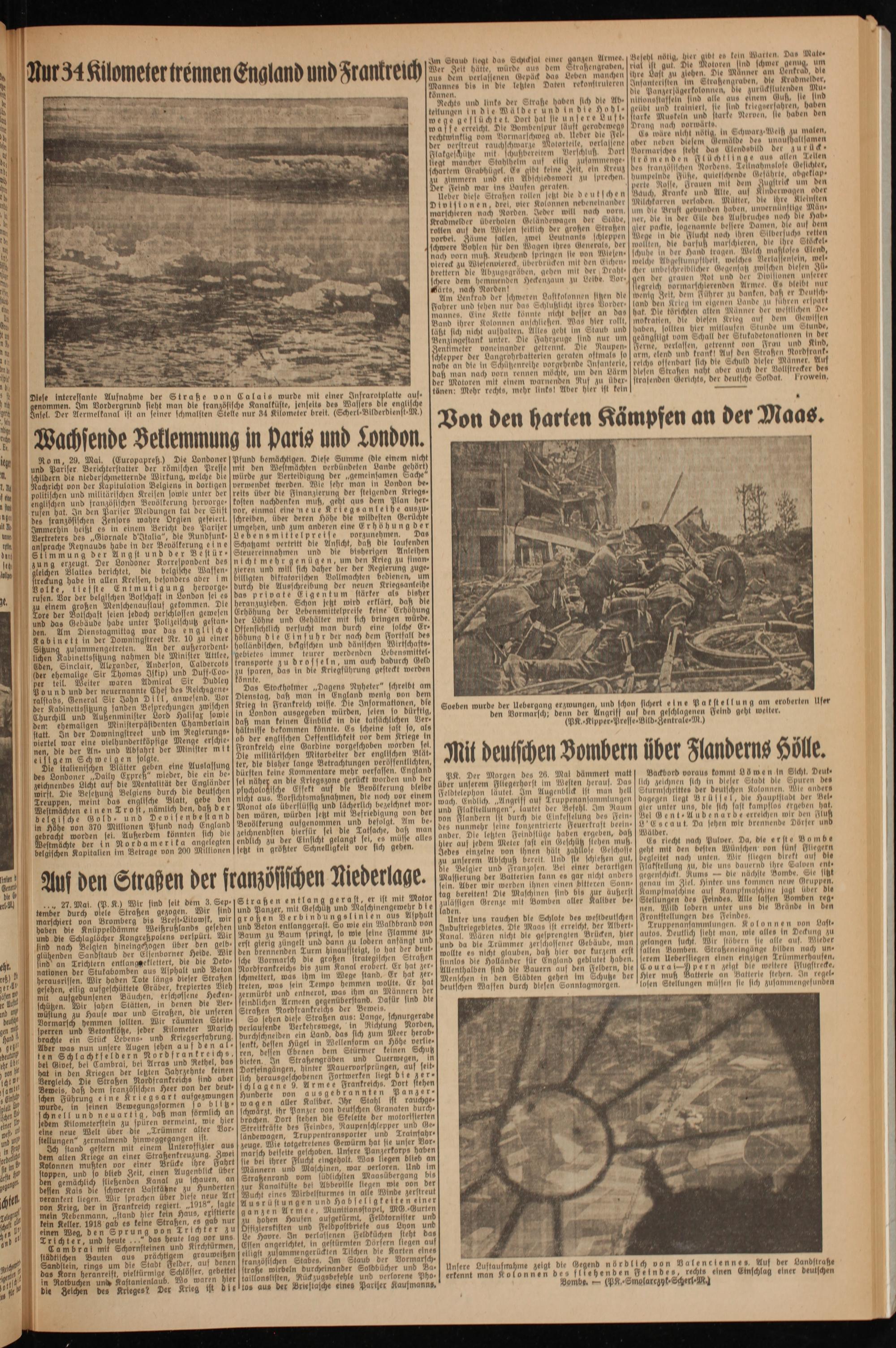 Unter UN« rauchen die Schlote des westdeutschen Industriegebiete». Die Maas ist erreicht, der Albert- Kanal. Wären nicht die gesprengten Brücken, hier und da die Trümmer zerschoßener Gebäude, man wallte es nicht glauben, daß hier vor kurzem erst Innloe die Holländer für England geblutet haben. Allenthalben sind die Bauern aus den Feldern, die Menschen in den Städten gehen Im Schutze der deutschen Massen durch diesen Sonntagmorgen.