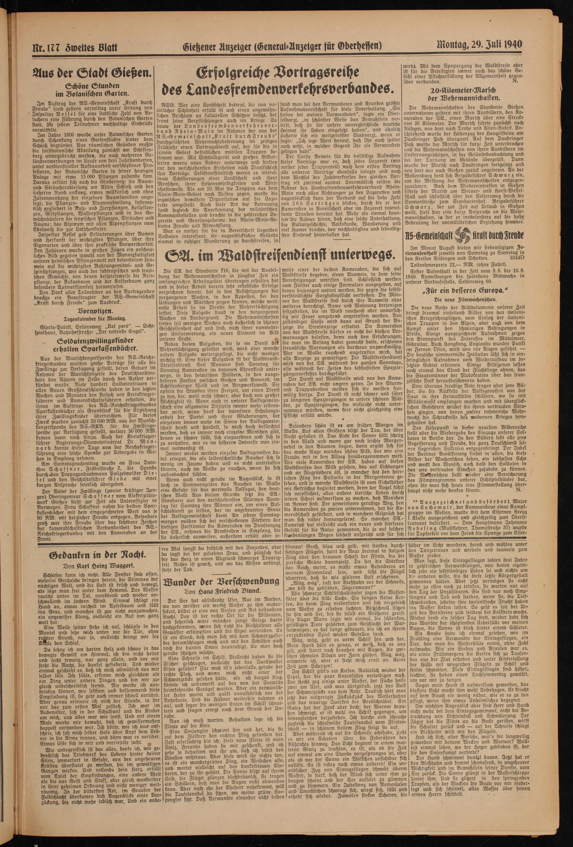 Die Wehrmannschaften des Standorts Gießen unternahmen gestern mit ihren Ausbildern, den Kameraden der SA., einen Marsch über eine Strecke von 20 Kilometer. Der Marsch führte zunächst nach Rödgen, von dort nach Trohe und Alten-Buseck. Anschließend wurde der Höhenzug des Hangelsteins am Daubringer Paß überquert. Auf dem Saubringer Paß wurde der Marsch für kurze Zeit unterbrochen und die Wehrmannschaften von ihren Ausbildern im Entfernungsschätzen, in der Geländebeobachtung und bei der Tarnung im Gelände überprüft. Dann wurde der Marsch nach Daubringen fortgesetzt und von dort aus nach Gießen zurück angetreten. An der Wellersburg fand sich Brigadeführer Schwarz ein, um die Meldung der Wehrmannschaften entgegenzunehmen. Nach dem Wiedereintreffen in Gießen führte der Marsch um Werner- und Horst-Wessel- Wall und schließlich über den Seltersweg durch die Sonnenstraße zum Standartenhof. Brigadeführer Schwarz, der zur Zeit auf Urlaub in Gießen weilt, hielt hier eine kurze Ansprache an die Wehrmannschaften, in der er insbesondere auf die hohe Bedeutung der vormilitärischen Erziehung hinwies. HHenieinW M W öurOeuöe