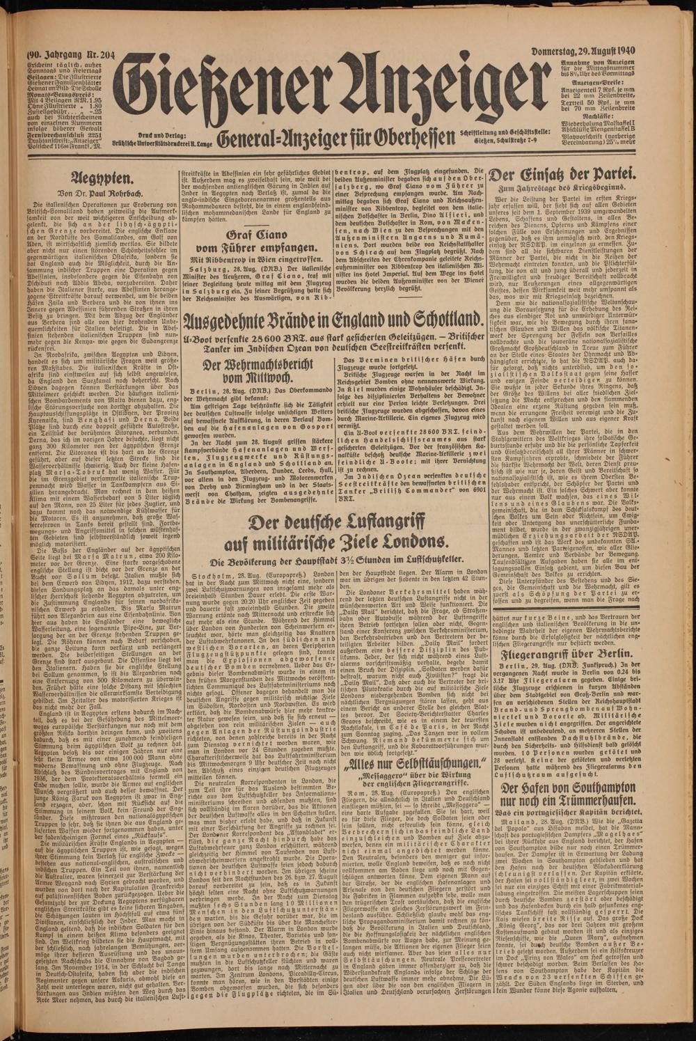 In der Nacht zum 28. August griffen stärkere Kampfverbände Hafenanlagen und Werften, Flugzeugwerke und Rüstungs- anlagen in England und Schottland an. In Southampton, Aberdeen, Dundee, Leeds, Hutt, vor allem in den Flugzeug- und Motorenwerken von Derby und Birmingham und in der Slaats- werft von Lhatham, zeigten ausgedehnte Brände die Wirkung der Bombenangriffe.