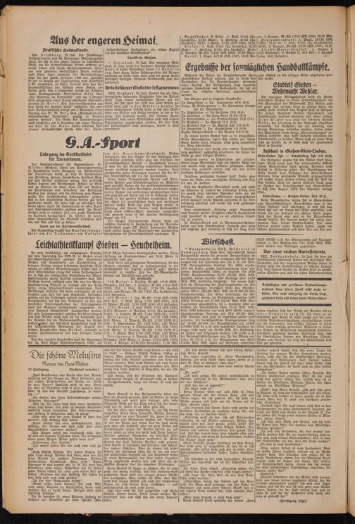Arn morgigen Mittwochabend trifft die Stadtmannschaft Gießen in einem Freundschaftsspiel auf eine Mannschaft der Wehrmacht. Den Gästen geht ein guter Ruf voraus, denn es gelang ihnen, die gewiß starke Stadtelf von Wetzlar hoch zu schlagen. Die beiden Wetzlarer Vereine Sportverein und Sportfreunde wurden ebenfalls von ihnen besiegt. In der Elf spielt u. a. auch der bekannte Spieler M ö b s, der jahrelang in der Eintracht Frankfurt mitwirkte. Die Gießener, die am Sonntag eine knappe Niederlage einstecken mußten, haben daher ihre Mannschaft durch einige „Neuerwerbungen" erheblich verstärkt; man hofft dadurch besonders die Stürmerreihe zu beleben. Wenn auch an einen Sieg nicht zu denken ist, so steht doch ein spannendes Spiel in Aussicht.