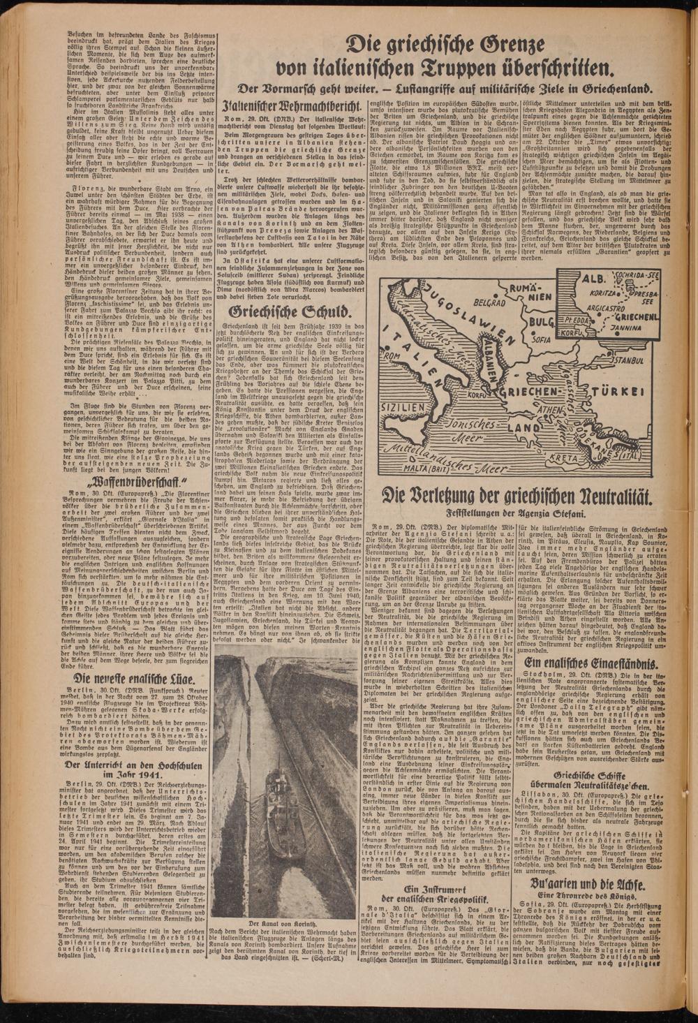 Weniger bekannt find dagegen die Verletzungen der Neutralität, die die griechische Regierung im Rahmen der internationalen Bestimmungen über die Neutralität begangen hat. Die Territorialgewässer, die Küsten und die Häsen Griechenlands wurden und werden noch von der englischen Flotte als Operationsbasis gegen Italien benutzt. Mit der griechischen Regierung als Komplizen konnte England in dem