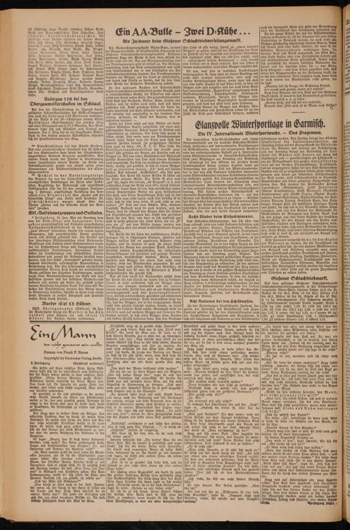 Die bayerischen Schi-Meisterschaften und einige Vorrundenspiele um die deutsche Eishockey-Meisterschaft, verbunden mit internationalen Vorführungen im Eiskunstläufen, waren am vergangenen Wochenende der vielversprechende Auftakt zur 4. Internationalen Winterspottwoche in Garmisch-Partenkirchen. Nach zwei Ruhetagen am Dienstag und Mittwoch, die allerdings bet den Aktiven im Zeichen Hatter Trainingsarbeit stehen werden, beginnt bann am Donnerstag ber zweite Teil ber Wintersportwoche, ber in ben von acht Nationen beschickten internationalen Schiwettkämpfen unb bem Sechsländer-Turnier im Eishockey gipfelt. Die Olympia-Kampfstätten im Werbenfelser Lanb werben ber Schauplatz einer internationalen Wintersportveranstaltung sein, wie sie kein anberes Land in diesem Winter durchzuführen vermag. Mit diesem großen Wintersportfest in Garmisch-Pattenkirchen verbinden sich — um ben Worten bes Reichsspottführers zu folgen — Gefühle des Stolzes über das neugeschaffene Gut des deutschen Spottes, der Freude über ben Besuch unserer ausländischen Freunde und ber Dankbarkeit für unseren Führer, bem wir auch bieses Ereignis verbanken!