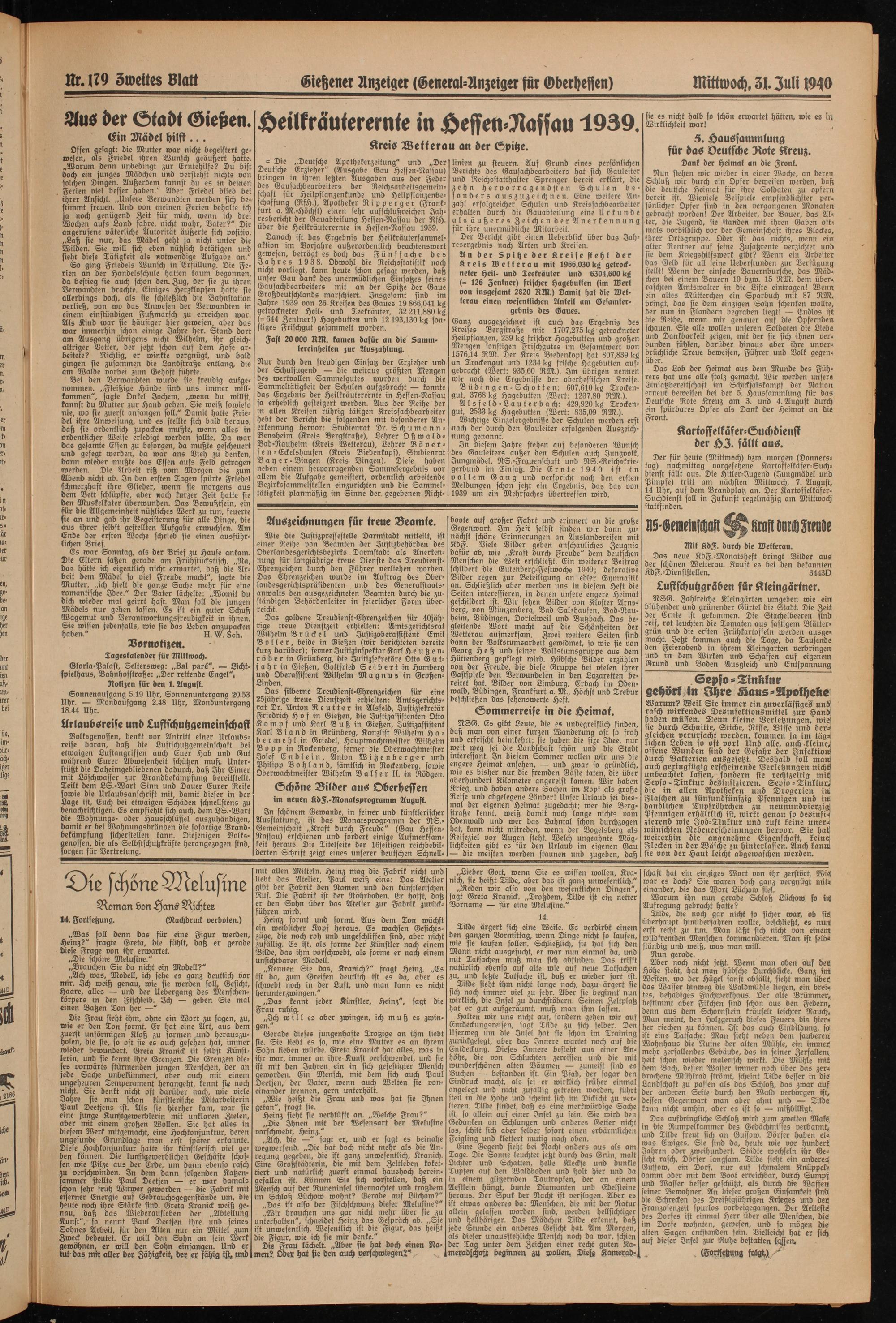 Der für heute (Mittwoch) bzw. morgen (Donnerstag) nachmittag vorgesehene Kartoffelkäfer-Suchdienst fällt aus. Die Hitler-Jugend (Jungmädel und Pimpfe) tritt am nächsten Mittwoch, 7. August, 14 Uhr, auf dem Brandplatz an. Der Kartoffelkäfer- Suchdienst soll in Zukunft regelmäßig am Mittwoch ftattfinben.