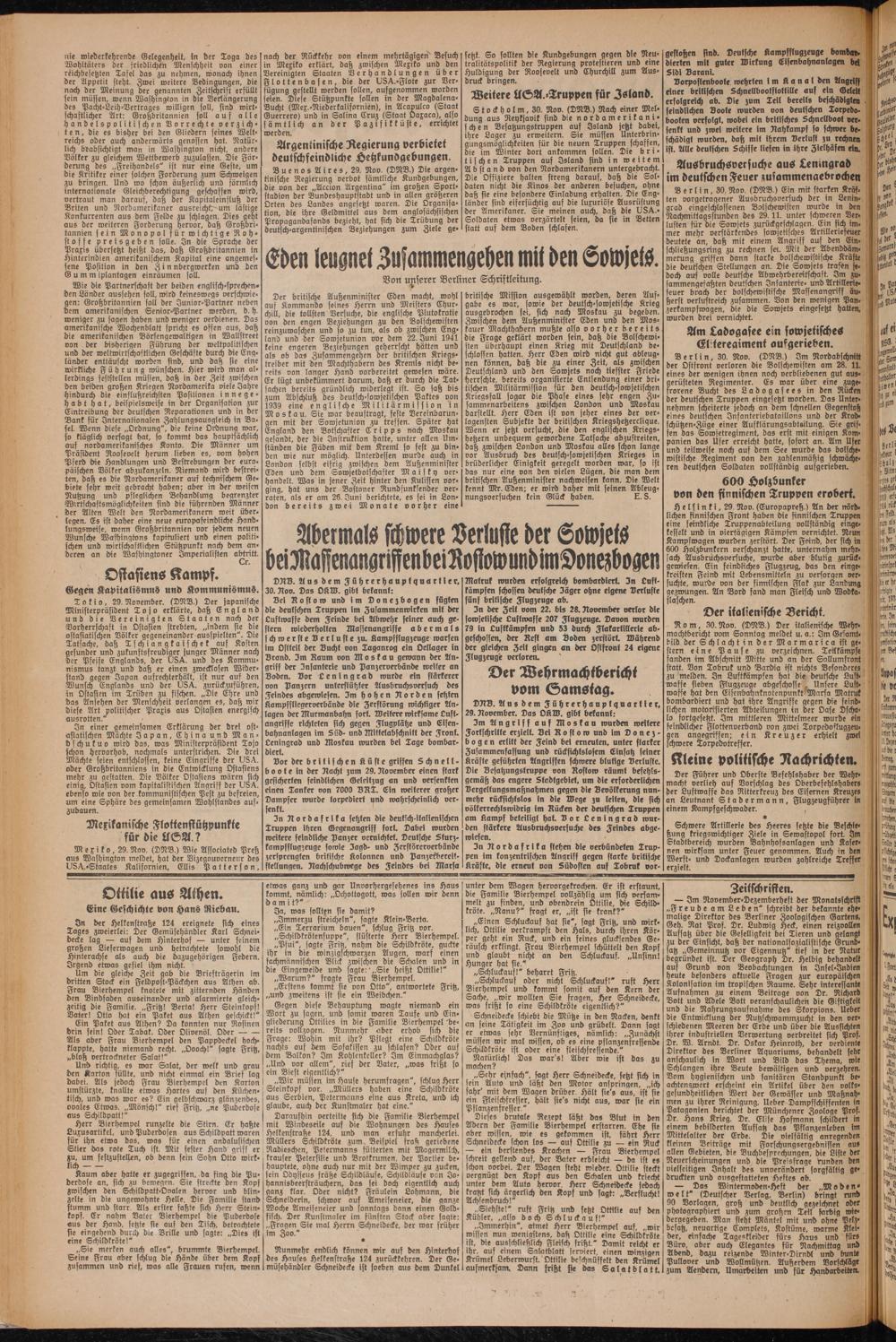 3m Angriff auf Moskau wurden weitere Fortschritte erzielt. Bei Rostow und im Donezbogen erlitt der Feind bei erneuten, unter starker Zusammenfassung und rücksichtslosem Einsatz feiner Kräfte geführten Angriffen schwere blutige Berluste. Die Besahungstruppe von Rostow räumt befehlsgemäß das engere Stadtgebiet, um die erforderlichen Bergeltungsmaßnahmen gegen die Bevölkerung nunmehr rücksichtslos in die Wege zu leiten, die sich völkerrechtswidrig im Rücken der deutschen Truppen am Kampf beteiligt hat. Bor Leningrad wurden stärkere Ausbruchsversuche des Feindes abge- roiefen.