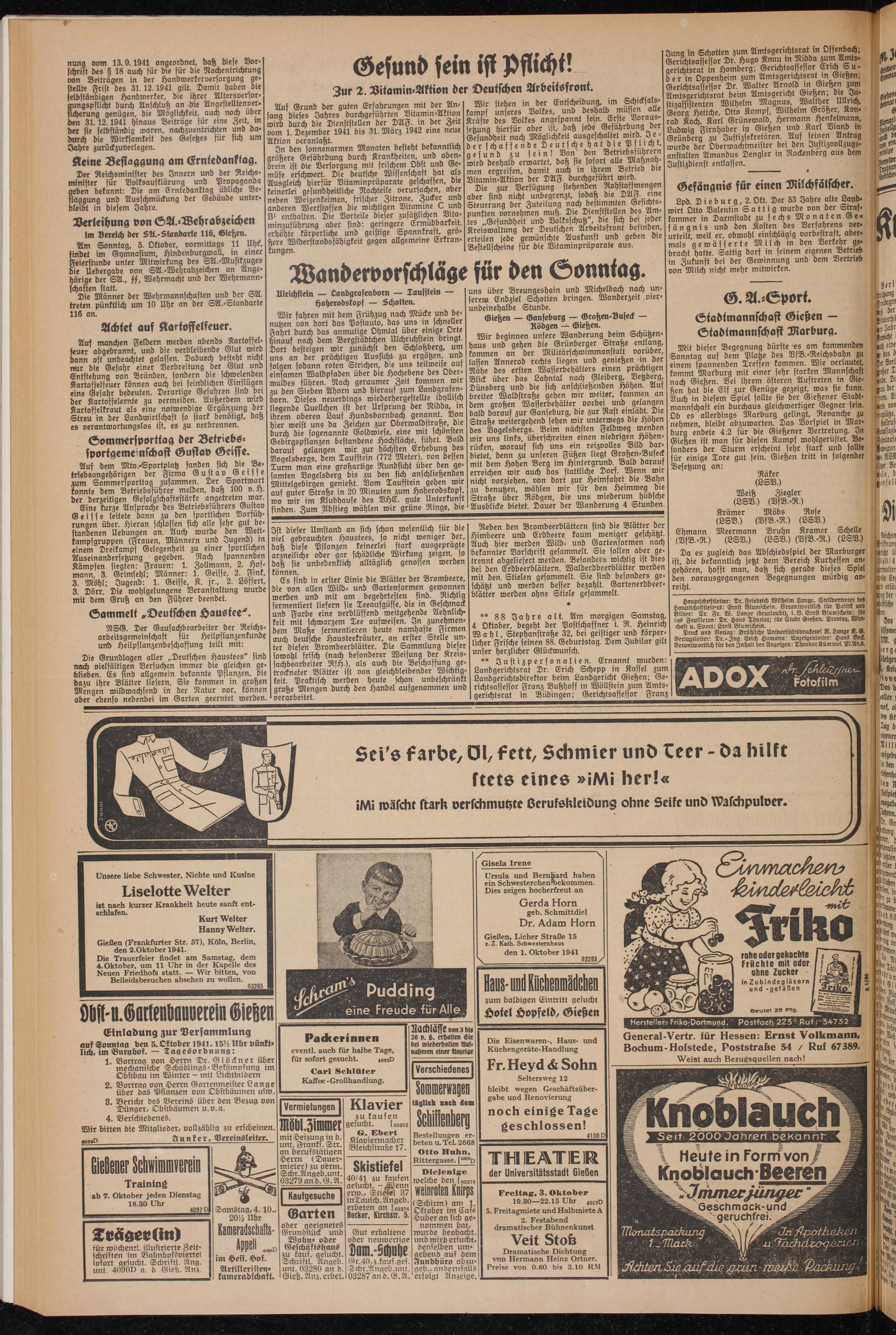 Gießen (Frankfurter Str. 57), Köln, Berlin, den 2.Oktober 1941.