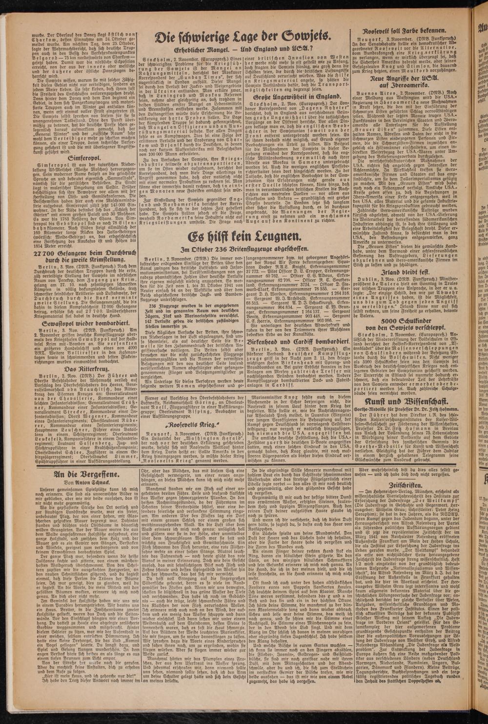 Berlin, 3. Nov. (DNB. Funkspruch.) Am 2. November griffen deutsche Kampfflugzeuge abermals den Kriegshafen Sewastopol auf der Halbinsel Krim mit-Bomben an. Sie versenkten ein größeres Handelsschiff und eines von 4000 BRT. Weitere Volltreffer in den Hafenanlagen sowie in schwimmenden und festen Flakein- richtungen wurden einwandfrei beobachtet.