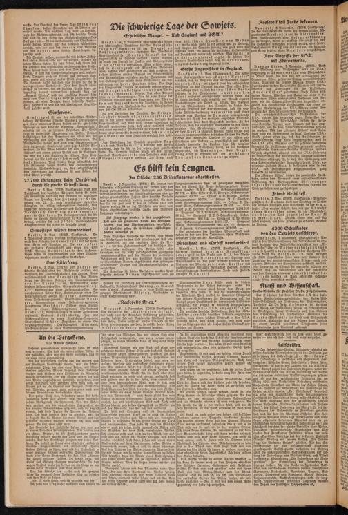 Marineminister Knox fehlte auch in diesem Wochenende in der Schar derjenigen nicht, die Roosevelt in seinem Lauf hinter dem Krieg her begleiten. Also stellte er, wie die Nachrichtenagentur Associated Preß meldet, in Quantico (Virginia) vor jungen Seeoffizieren die Behauptung auf, der Kampf gegen Deutschland sei vorwiegend Selbstverteidigung; nur vergaß er natürlich hinzuzufügen, daß niemand die USA. angegriffen hat.