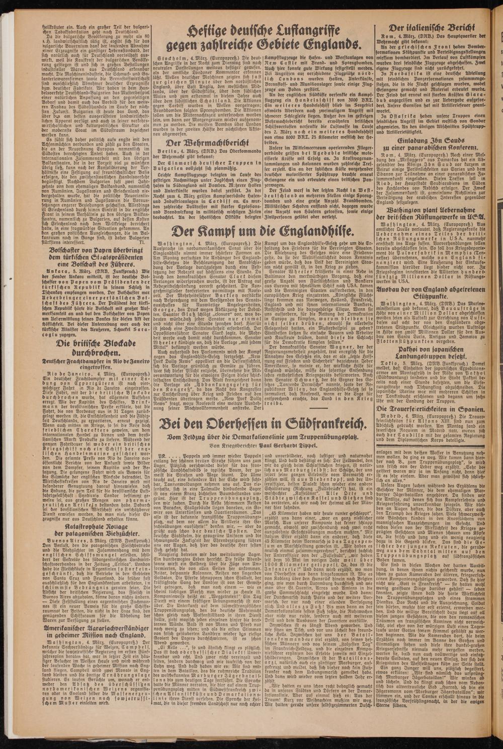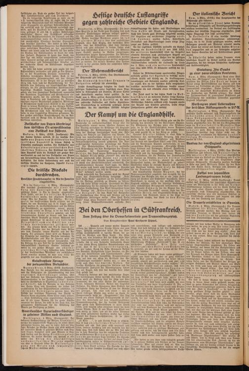 An der englischen Südküste versenkte ein Kampfflugzeug ein Handelsschiff von 3000 BRT. Ein weiteres Handelsschiff blieb im Seegebkt ostwärts Aberdeen nach zweimaligem Angriff mit schwerer Schlagseite liegen. Außer den im gestrigen Wehrmachtsbericht bereits erwähnten britischen Schiffsverlusten versenkte die Luftwaffe im Laufe des 2. März noch ein weiteres Handelsschiff von etwa 8000 BRT. 25 Kilometer westlich der Hebriden.