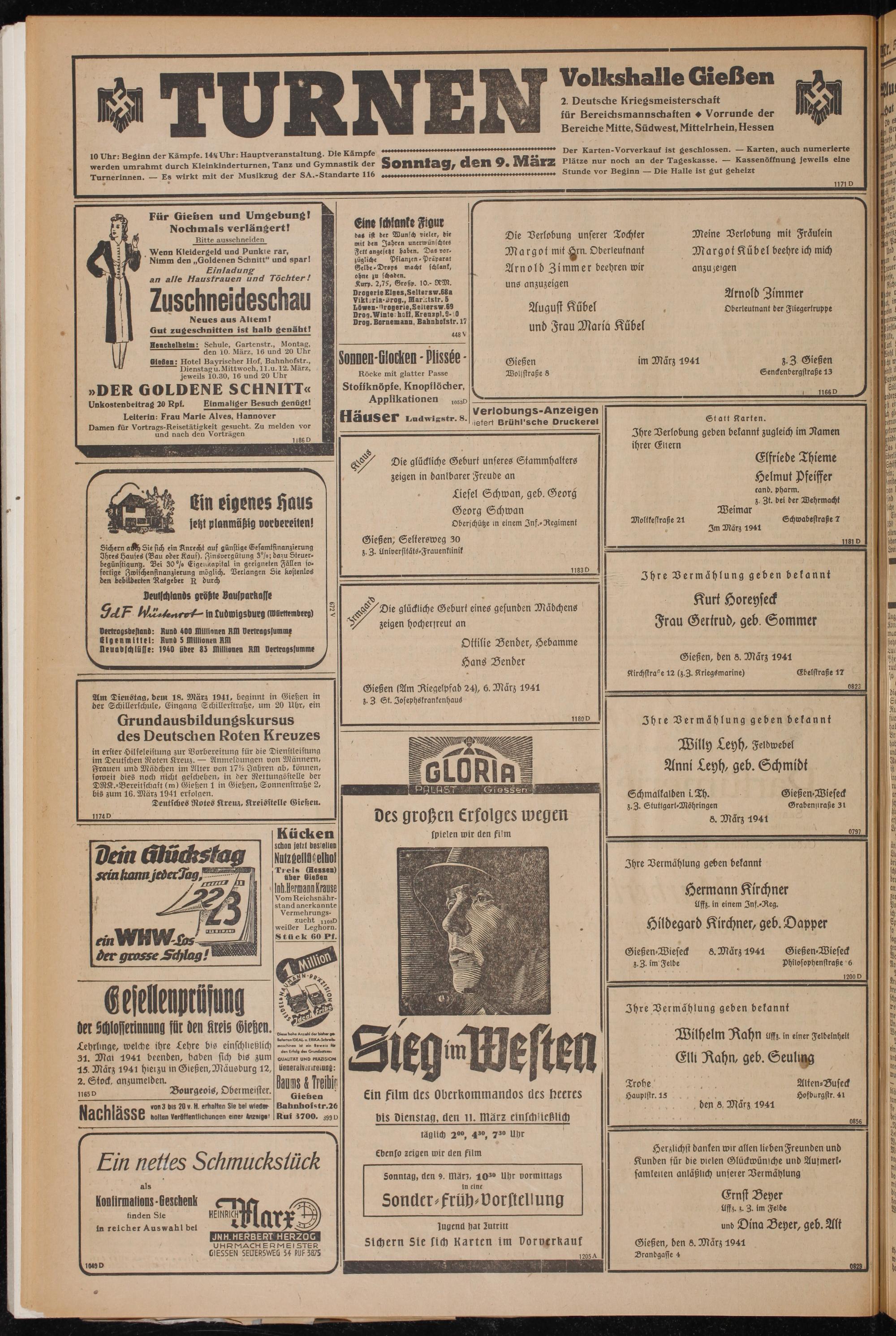 Am Dienstag, dem 18. März 1941, beginnt in Gieben in der Schillerschule, Eingang Schillerstrabe, um 20 Uhr, ein