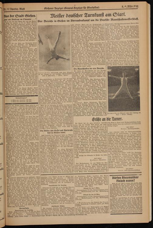 Zum erstenmal richtet der Nationalsozialistische Reichsbund für Leibesübungen in Gießen einen turnerischen Großkampf aus, der Zeugnis ablegen wird von der Aktivist des deutschen Sportlebens gerade im Kriege. Srärker als je, stärker als im Frieden drängt der deutsche Mensch, drängt vor allem die deutsche Jugend heute zu den Leibes- Übungen, damit beispielgebend von der ungebrochenen Kraft eines jungen Volkes und die Pflicht erkennend, die ihr die Zeit stellt. Der NSRL., beauftragt vom Führer, die Leibeserziehung des deutschen Volkes auszurichten, übernimmt damit eine wesentliche politische Aufgabe.