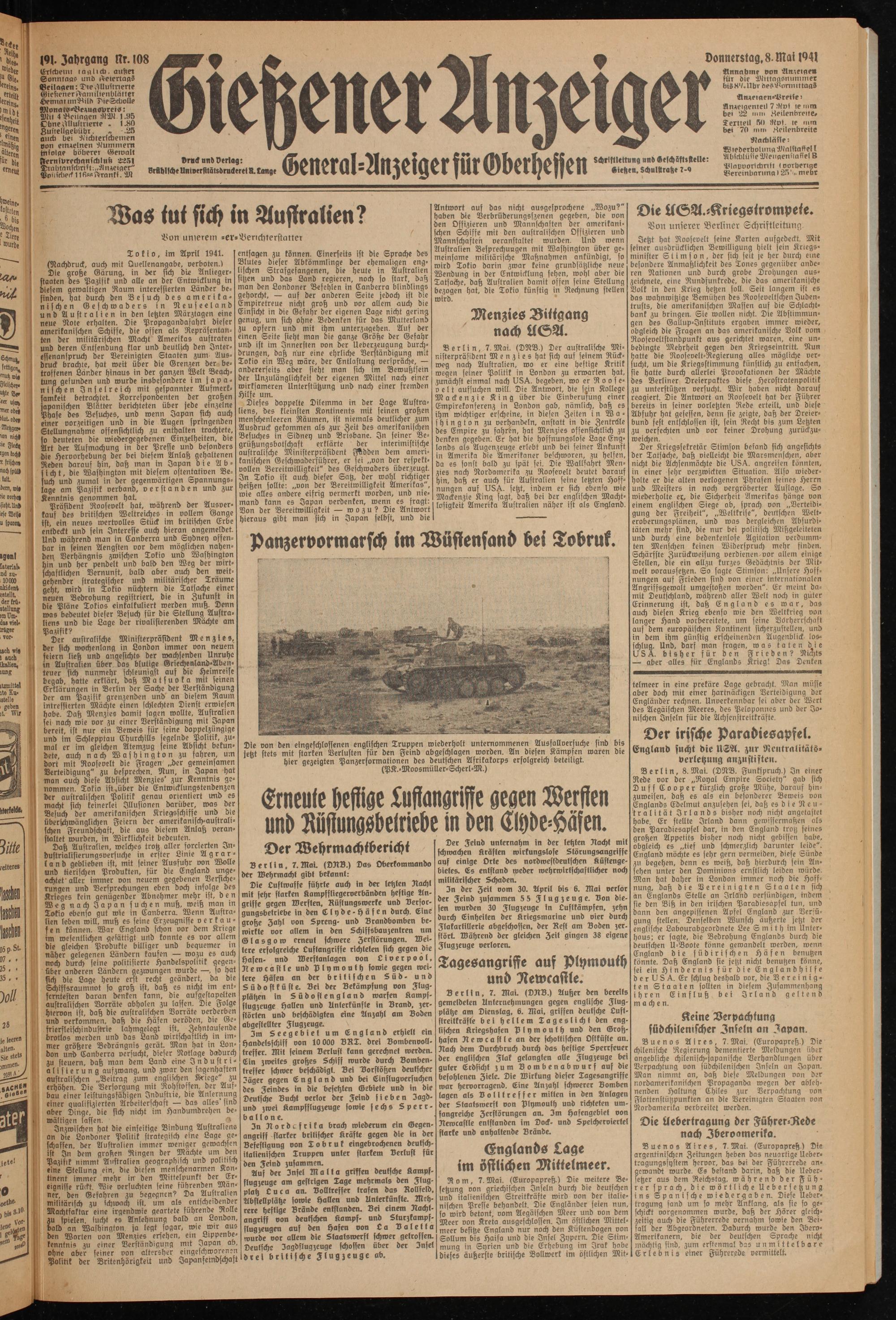Berlin, 7. Mai. (DNB.) Der australische Ministerpräsident Menzies hat sich auf seinem Rückweg nach Australien, wo er eine heftige Kritik wegen seiner Politik in London zu erwarten hat, zunächst einmal nach USA. begeben, wo er R o o s e- velt aufsuchen will. Die Antwort, die sein Kollege Mackenzie King über die Einberufung einer Empirekonferenz in London gab, nämlich, daß es ihm wichtiger erscheine, in diesen Zeiten i n Washington zu verhandeln, anstatt in die Zentrale des Empire zu fahren, hat Menzies offensichtlich zu denken gegeben. Er hat die hoffnungslose Lage Englands als Augenzeuge erlebt und bei seiner Ankunft in Amerika die Amerikaner beschworen, zu helfen,
