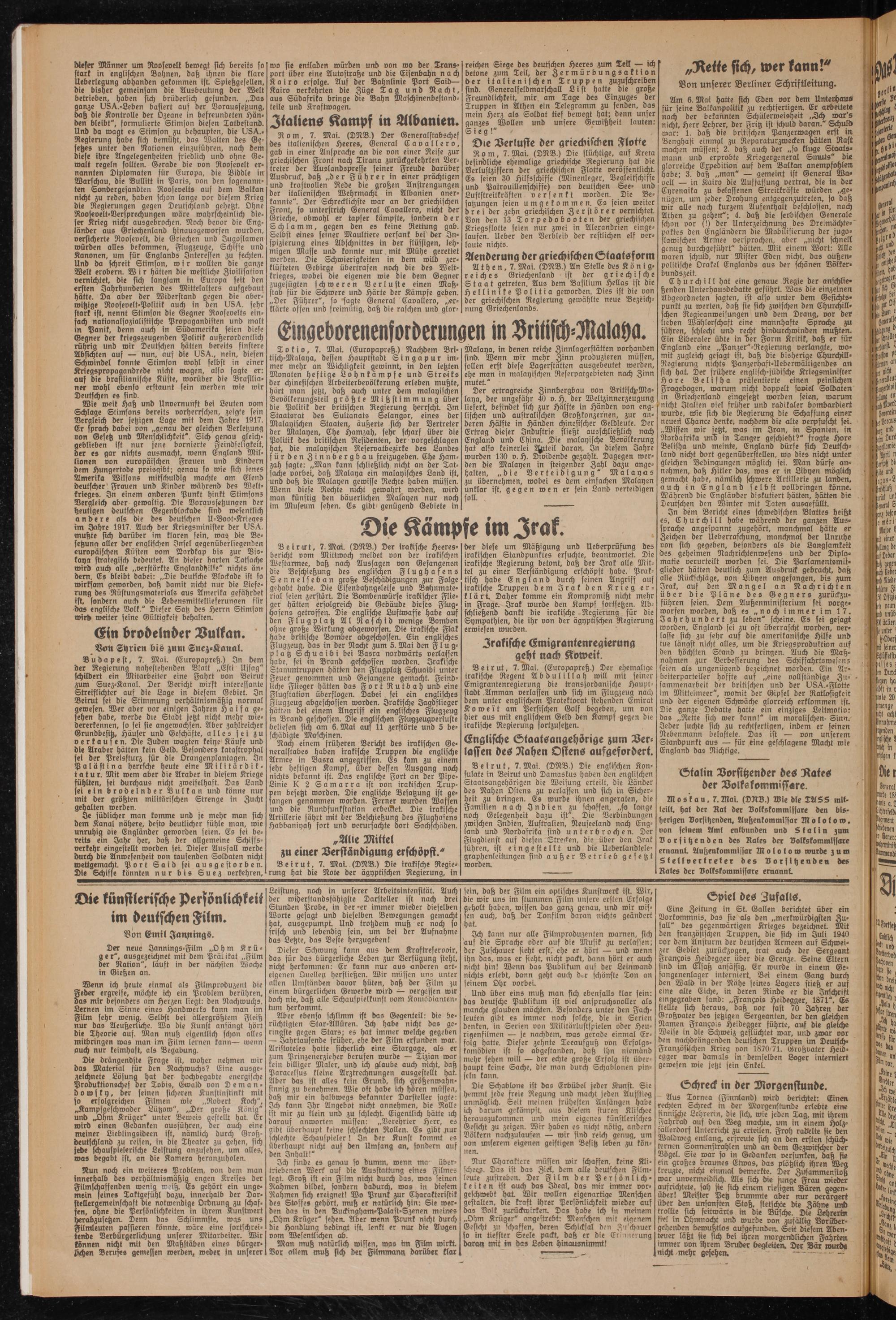 dieser Manner um Roosevelt bewegt sich bereits so stark in englischen Bahnen, daß ihnen die klare Ueberlegung abhanden gekommen ist. Spießgesellen, die bisher gemeinsam die Ausbeutung der Welt betrieben, haben sich brüderlich gefunden. „Das ganze USA.’ßeben basiert auf der Voraussetzung, daß die Kontrolle der Ozeane in befreundeten Händen bleibt", formulierte Stimson diesen Tatbestand. Und da waat es Stimson zu behaupten, die USA.. Regierung habe sich bemüht, das Walten des Gesetzes unter den Stationen einzufuhren, nach dem diese ihre Angelegenheiten friedlich und ohne Gewalt regeln sollten. Gerade die von Roosevelt ernannten Diplomaten für Europa, die Biddle in Warschau, die Bullitt in Paris, von den sogenannten Sondergesandten Roosevelts auf dem Balkan nicht zu reden, haben schon lange vor diesem Krieg die Regierungen gegen Deutschland gehetzt. Ohne Roosevelt-Versprechungen wäre wahrscheinlich dieser Krieg nicht ausgeorochen. Noch bevor die Engländer aus Griechenland hinausgeworfen wurden, versicherte Roosevelt, die Griechen und Jugoslawen wurden alles bekommen, Flugzeuge, Schiffe und Kanonen, um für Englands Interessen zu fechten. Und da schreit Stimson, w i r wollten die ganze Welt erobern. W i r hätten die westliche Zivilisation vernichtet, die sich langsam in Europa seit den ersten Jahrhunderten des Mittelalters aufgebaut hätte. Da aber der Widerstand gegen die aberwitzige Roosevelt-Politik auch in den USA. sehr stark ist, nennt Stimson die Gegner Roosevelts einfach nationalsozialistische Propagandisten und malt in Panik, denn auch in Südamerika seien diese Gegner der kriegszeugenden Politik außerordentlich rührig und wir Deutschen hätten bereits finstere Absichten auf — nun, aus die USA., nein, diesen Schwindel konnte Stimson wohl selbst in einer Kriegspropagandrede nicht wagen, also sagte er: auf die brasilianische Küste, worüber die Brasilianer wohl ebenso erstaunt sein werden wie wir Deutschen es sind.