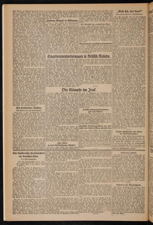 Nach einem früheren Bericht des irakischen Ge- neralftabes haben irakische Truppen die englische Armee in Basra angegriffen. Es kam zu einem sehr heftigen Kampf, über besten Ausgang noch nichts bekannt ist. Das englische Fort an der Pipe- Linie K 2 Gamarra ist von irakischen Trup- ven besetzt worden. Die englische Besatzung ist gefangen genommen worden. Ferner wurden Waffen und Die Rundfunkstation erbeiftet. Die irakische Artillerie fährt mit der Beschießung des Flughafens Habbaniyah fort und verursachte Dort Sachschäden.