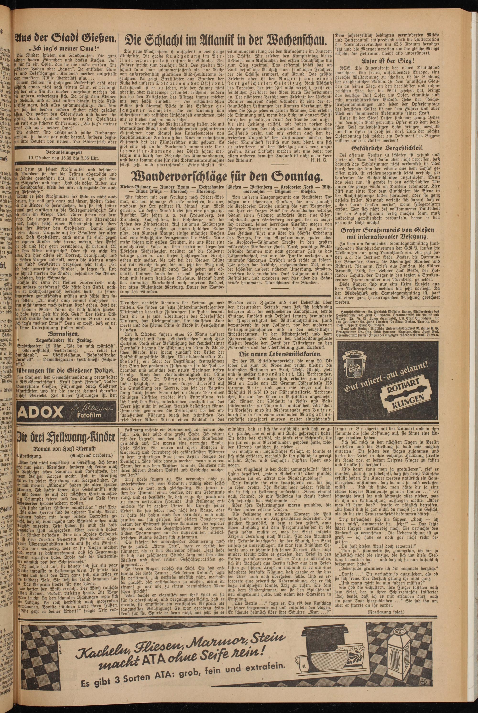 Hauptschristselter: Dr. Friedrich Wichelm Lange. Stellvertreter de« Haupticyristleit'-rr: Ernst Blumschein. Verantwortlich für Politik und Bilder: Dr. Fr. W. Lange (beurlaubt), i.B. Ernst Blumschein: für da« Feuilleton: Dr. Han« Thyriot: für Stadt Gietzen, Provinz, Wirt- chast u. Sport: Ernst Blumschein.