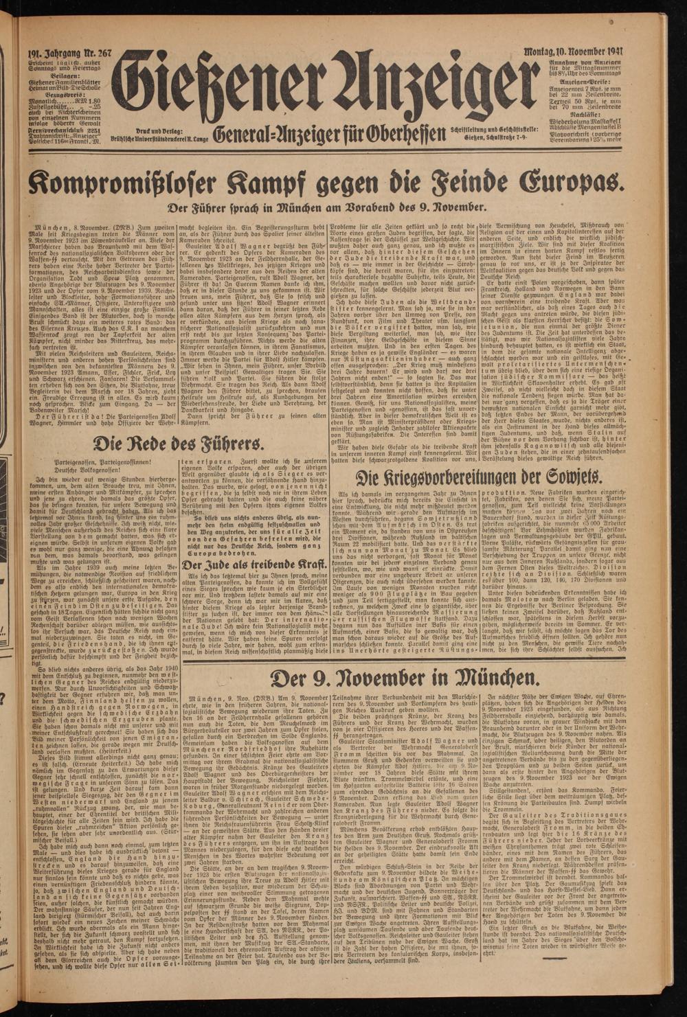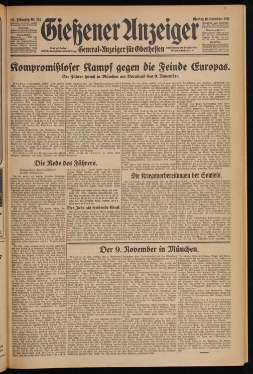 diese Vermischung von Heuchelei, Mißbrauch von Religion auf der einen und Kapitalinteressen auf veränderen Seite, und endlich die wirklich jüdisch- marxistischen Ziele. Wir sind mit dieser Koalition im Innern in einem harten Kampf restlos fertig geworden. Nun steht dieser Feind im Aeußeren genau so vor uns, er ist ja der Inspirator der Weltkoalition gegen das deutsche Volk und gegen das Deutsche Reich.