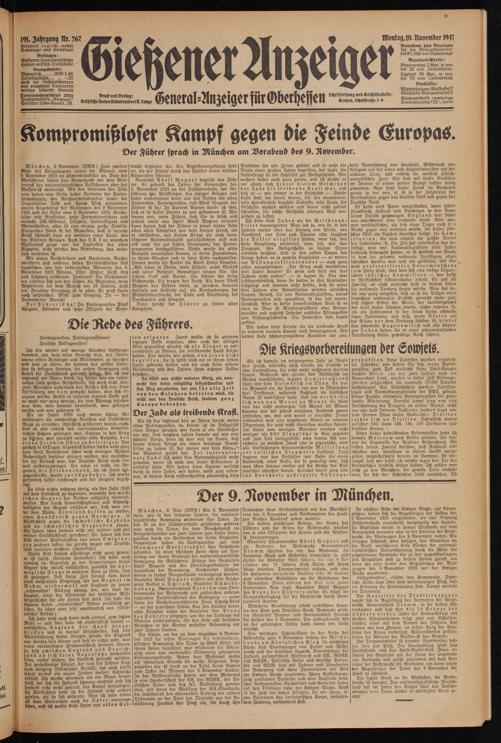 Als ich das letztemal hier zu Ihnen sprach, meine alten Parteigenossen, da konnte ich im Vollgefühl eines Sieges sprechen wie kaum je ein Sterblicher vor mir. Und trotzdem lastete damals auf mir eine schwere Sorge, denn ich war mir im klaren, daß hinter diesem Kriege als letzter derjenige Brandstifter zu suchen ist, der immer von dem Häno^ der Nationen gelebt hat: Der internationale Jude! Ich wäre kein Nationalsozialist mehr gewesen, wenn ich mich von dieser Erkenntnis je entfernt hätte. Wir haben seine Spuren verfolgt durch so viele Jahre, wir haben, wohl zum erstenmal, In diesem Reich wissenschaftlich planmäßig diese