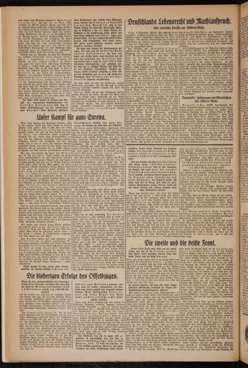 Ich werde sicher nicht einen Mann mehr opfern, als unbedingt notwendig ist. Wenn heute jemand da wäre, um Leningrad zu entsetzen, dann würde ich den Befehl geben, es zu stürmen, und wir würden es stürmen. (Wieder bricht tosender Beifall los.) Denn wer von der ostpreußischen Grenze bis 10 Kilometer vqr Leninarad gestürmt ist, der kann auch noch die. zehn Kilometer vor Leningrad bis in die Stadt hineinmarschieren. (Abermals umtost ein Sturm der Begeisterung den Führer.)