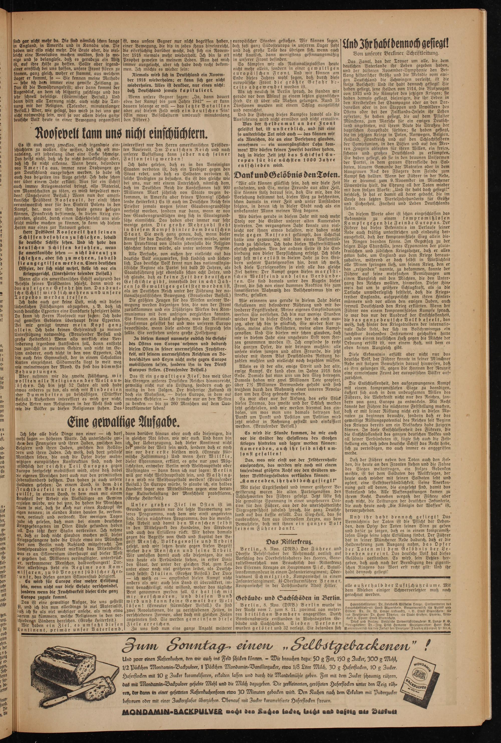 Das Fanal, das der Trauer um alle, die dem deutschen Daterlande ihr Leben gegeben haben, und der düsteren November-Symphonie den Beiklang historischer Größe und die Melodie vom ewigen Deutschland die Schwingen verleiht, ist stolze Botschaft: Und ihr habt dennoch gesiegt! Sie haben gesiegt, jene Helden von 1914, die Blutzeugen von 1923 und die Kämpfer des jetzigen Krieges; sie haben damals gesiegt, diejenigen, die ihr Leben in den Kreidefelsen der Champagne ober an den Dardanellen oder in den Steppen und Urwäldern des Ostens oder bei den Falklands-Inseln ihr Leben opferten; sie haben gesiegt, die auf dem Pflaster Münchens, zum Marsche für ein ewiges Deutschland angetreten, mit ihrem Blute die Straßen der bayrischen Hauptstadt färbten; sie haben gesiegt, die im jetzigen Kriege in Polen, Norwegen, Belchen, Holland, Frankreich und auf den Schlachtfeldern der Sowjetunion, in den Lüften und auf den Meeren Zeugnis ablegten für ihren Willen, ein freies, sicheres und großes Deutschland zu erkämpfen. Sie haben gesiegt, ob sie in den braunen Uniformen der Partei, in dem grauen Ehrenkleide des Soldaten, blauem Gewände der Matrosen oder in dem blaugrauen Rock des Fliegers dem Feinde zum Kampf sich stellten. Wenn der Führer in der Rede, die er diesmal zum 9. November im Münchener Löwenbräu hielt, die Ehrung all der Toten wieder mit dem stolzen Worte: „Und ihr habt doch gesiegt!" beschloß, so hat er damit all derer gedacht, die im Laufe des letzten Vierteljahrhunderts für Große und Sicherheit, Freiheit und Leben Deutschlands fielen.