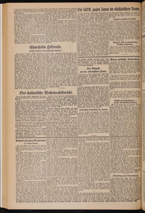 Im Morgengrauen des 9. Februar ist, durch starken Nebel begünstigt, ein feindlicher Flot- tenverband vor Genua erschienen. Trotz sofortigen Eingreifens der Küstenabwehr der Kriegsmarine haben die feindlichen Salven, die keine militärischen Ziele trafen, nach den bisherigen Ermittlungen 7 2 Tote und 226 Verwundete unter der Zivilbevölkerung sowie beträchtlichen Sachschaden an Wohnhäusern zur Folge gehabt. Die Ruhe und Disziplin der Bevölkerung Genuas war über jedes Lob erhaben. Eicke unserer Luftformationen hat am Nachmittag die feindlichen Schiffe erreicht und einen Kreuzer durch eine Bombe am