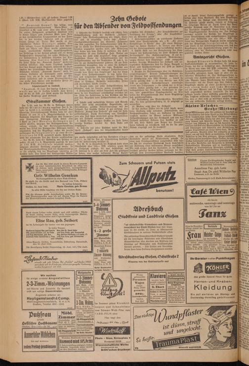 Das alphabetische Einwohner- und Firmenverzeichnis der Stadt Gießen liegt drei Tage, vom 12. bis einschl. 14. Juni, zu jedermanns Einsichtnahme in unserer Geschäftsstelle offen Die zuständige Einwohnerschaft Gießens sowohl als die beteiligten Behörden und öffentlichen Körperschaften usw. werden um Prüfung der Einträge auf Richtigkeit und Vollständigkeit hiermit gebeten. - Für Fehler und Unrichtigkeiten kann keine Haftung übernommen werden