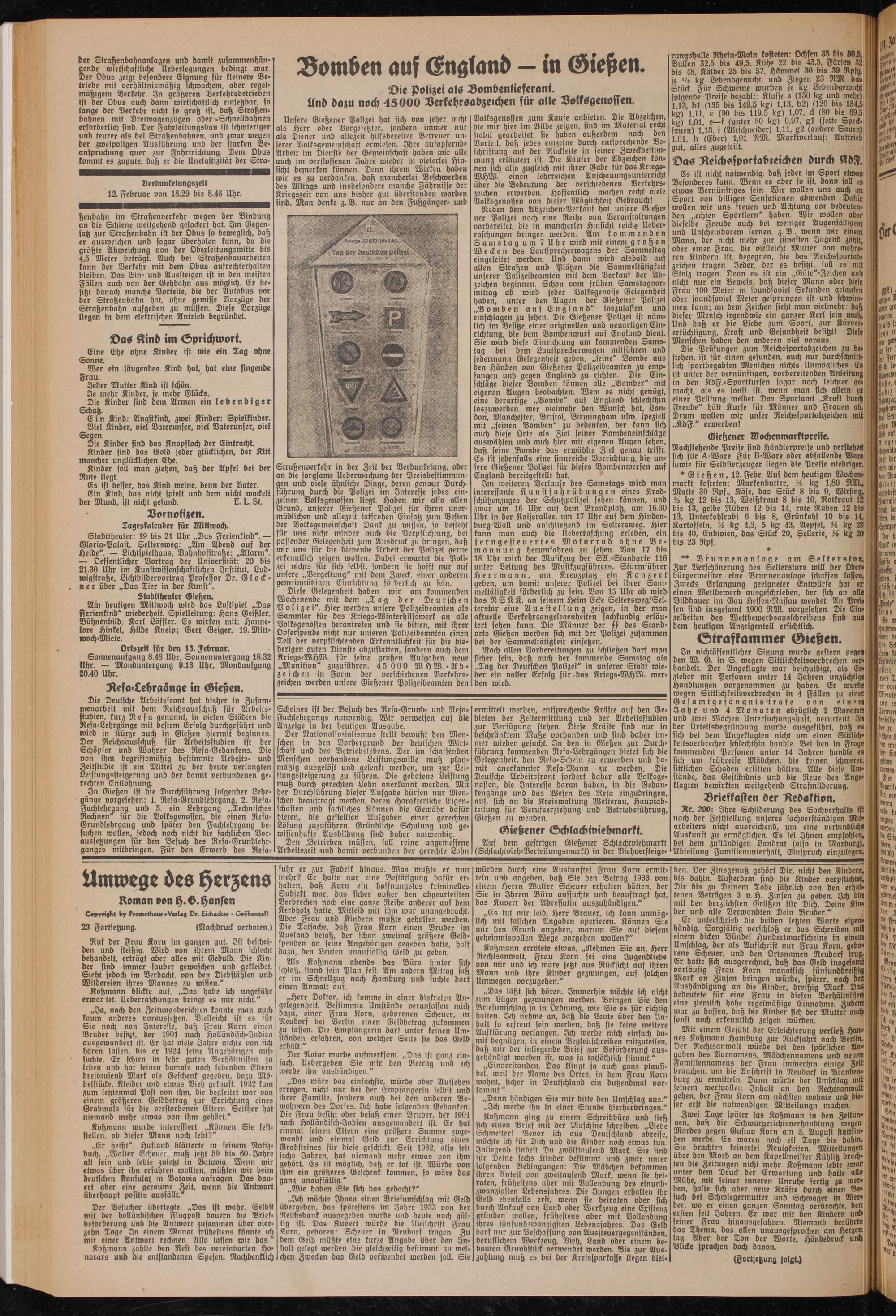 Diese Gelegenheit haben mir am kommenden Wochenende mit dem „Tag der Deutschen Polizei". Hier werden unsere Polizeibeamten als Sammler für das Kriegs-Winterhilfswerk an alle Volksgenossen herantreten und sie bitten, mit ihrer Opferspende nicht nur unseren Polizeibeamten einen Teil der verpflichtenden Erkenntlichkeit für die bisherigen guten Dienste adzustatten, sondern auch dem Kriegs-WHW. für feine großen Aufgaben neue „Munition" zuzuführen. 45 000 WHW. - Ab - zeichen in Form der verschiedenen Verkehrszeichen werden unsere Gießener Polizeibeamten den