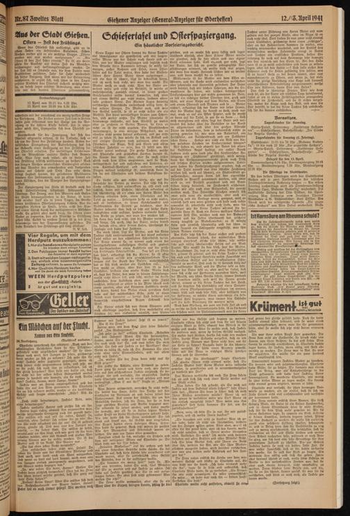 mel einen Strich durch die wohlgemeinten Absichten i Mutter bedeutet ihm. daß es fetzt auf solche Spitz- macht. Es gehört aber wohl dazu, für Ostern jenes | finbigfeiten nicht ankäme, sondern vielmehr daraus, Wetter zu erwarten, das alle Wünsche in Erfüllung dem Kinde zu zeigen, wie man das machen soll.. gehen läßt. Selbst in ernsten Zeiten ist ja tor Lenz i Ich kann das doch nicht, setzt die Mutter vorwurfs- keineswegs von tor Tagesordnung gestrichen. Die voll hinzu. Ich weiß, sagt der Vater, vieles kannst frohe Botschaft des Frühlings gilt trotz alledem! du, beinah alles, aber keinen Hasen, überhaupt Die Zoologie und dann das Zeichnen ...
