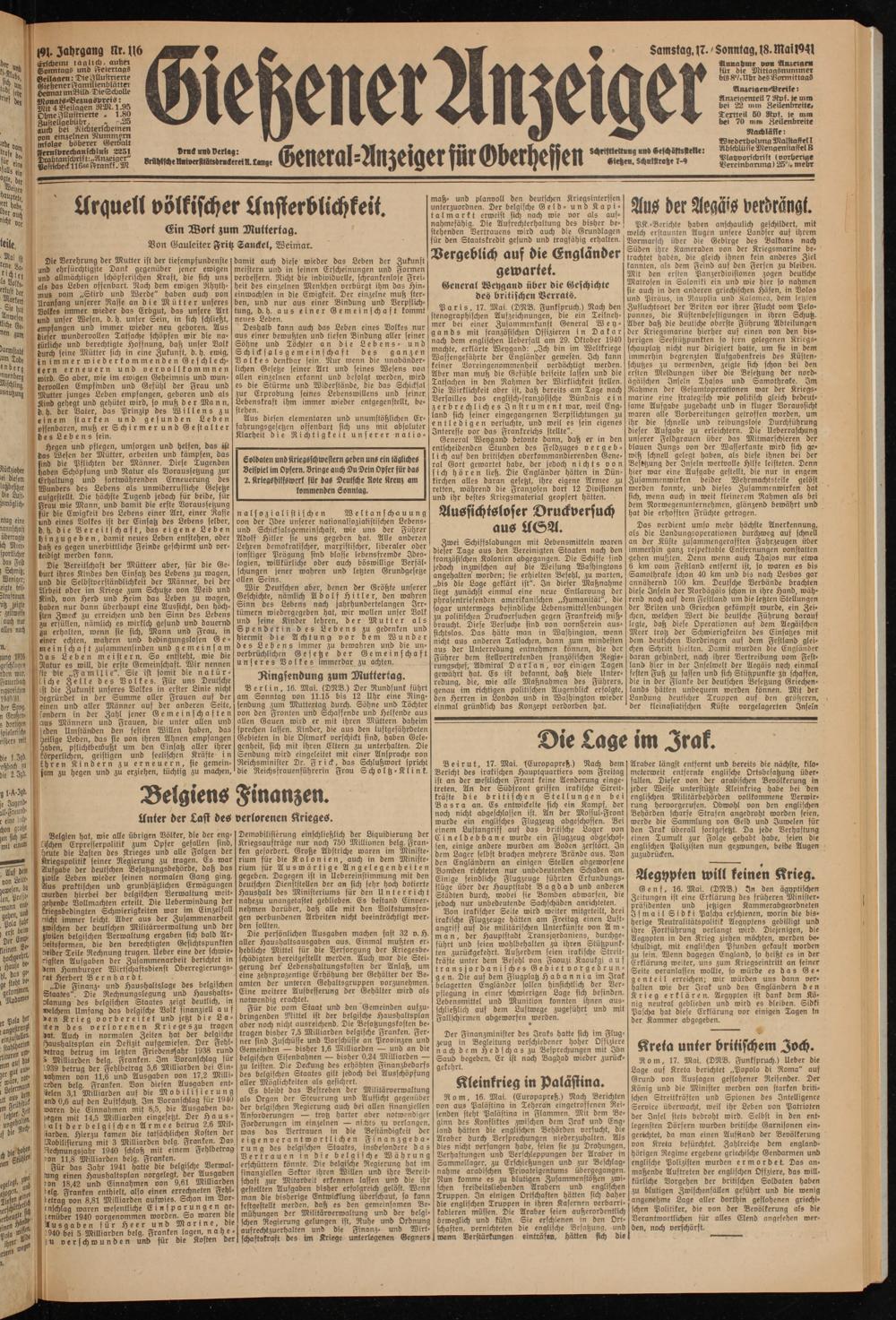 Beirut, 17. Mai. '(Europapreß.) Nach dem Bericht des irakischen Hauptquartiers vom Freitag ist an der westlichen Front keine Aenderung eingetreten. An der Südfront griffen irakische Streitkräfte die britischen Stellungen bei Basra an. Es entwickelte sich ein Kampf, der noch nicht abgeschlossen ist. An der Mossul-Front wurde ein englisches Flugzeug abgeschossen. Bei einem Luftangriff auf das britische Lager von Cineldebbane wurde ein Flugzeug abgeschossen, einige andere wurden am Boden zerstört. In dem Lager selbst brachen mehrere Brände aus. Don den Engländern an einigen Stellen abgeworfene Bomben richteten nur unbedeutenden Schaden an. Einige feindliche Flugzeuge führten Erkundungsflüge über der Hauptstadt Bagdad und anderen Städten durch, wobei sie Bomben abwarfen, die jedoch nur unbedeutende Sachschäden anrichteten.