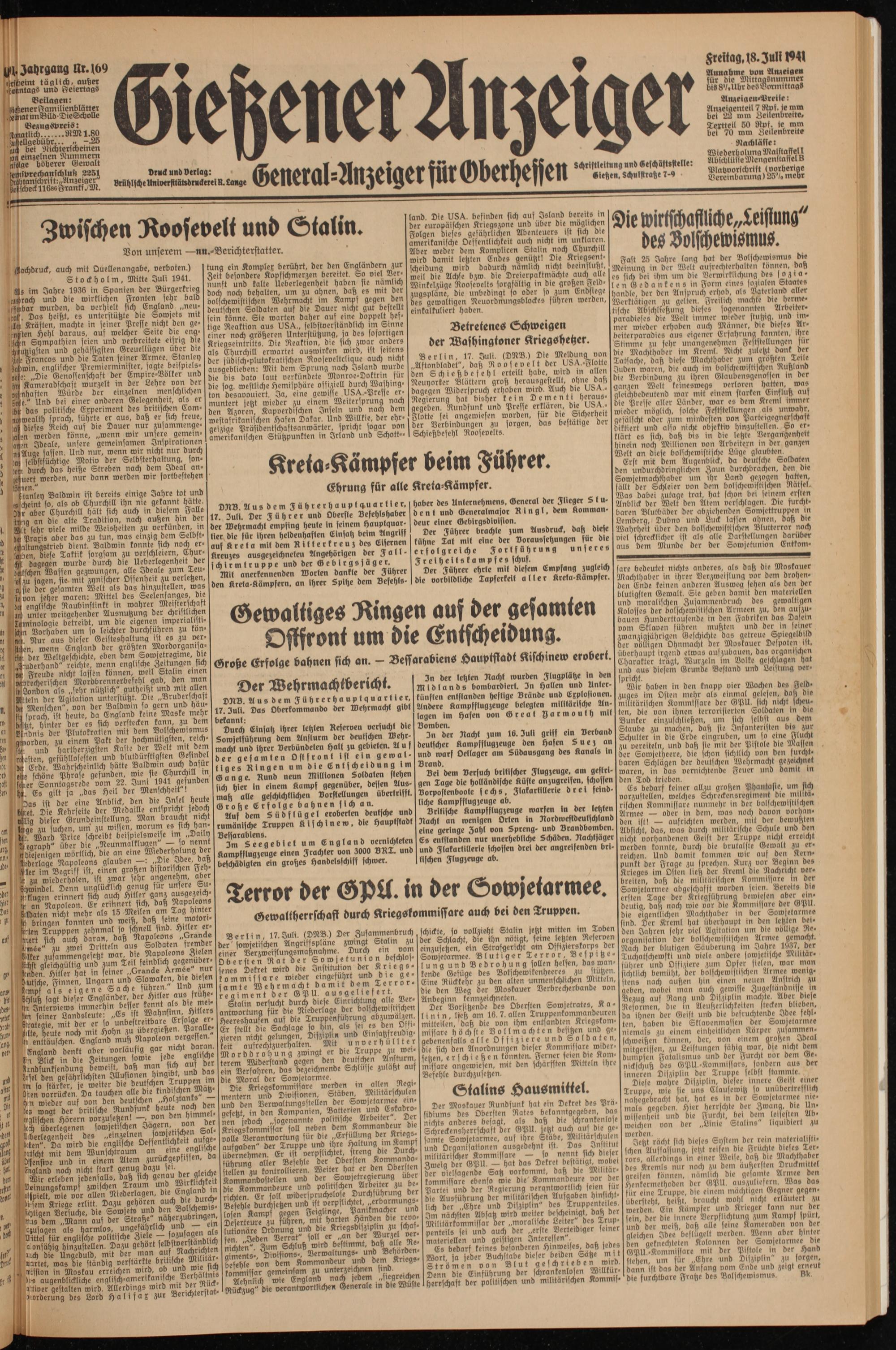 ^ Wir haben in den knapp vier Wochen des Feldzuges im Osten mehr als einmal gelesen, daß Die militärischen Kommissare der GPU. sich nicht |d}eu- ton, bic von ihnen terrorisierten Soldaten in die Bunker einzuschliehen, um sich selbst aus dem Staube zu machen, daß sie Infanteristen bis zur Schulter in die Erde eingruben, um so eine Flucht zu vereiteln, und daß sie mit der Pistole die Massen der Sowjetheere, die schon sichtlich von den furcht- Vrand. I baren Schlägen der deutschen Wehrmacht gezeichnet