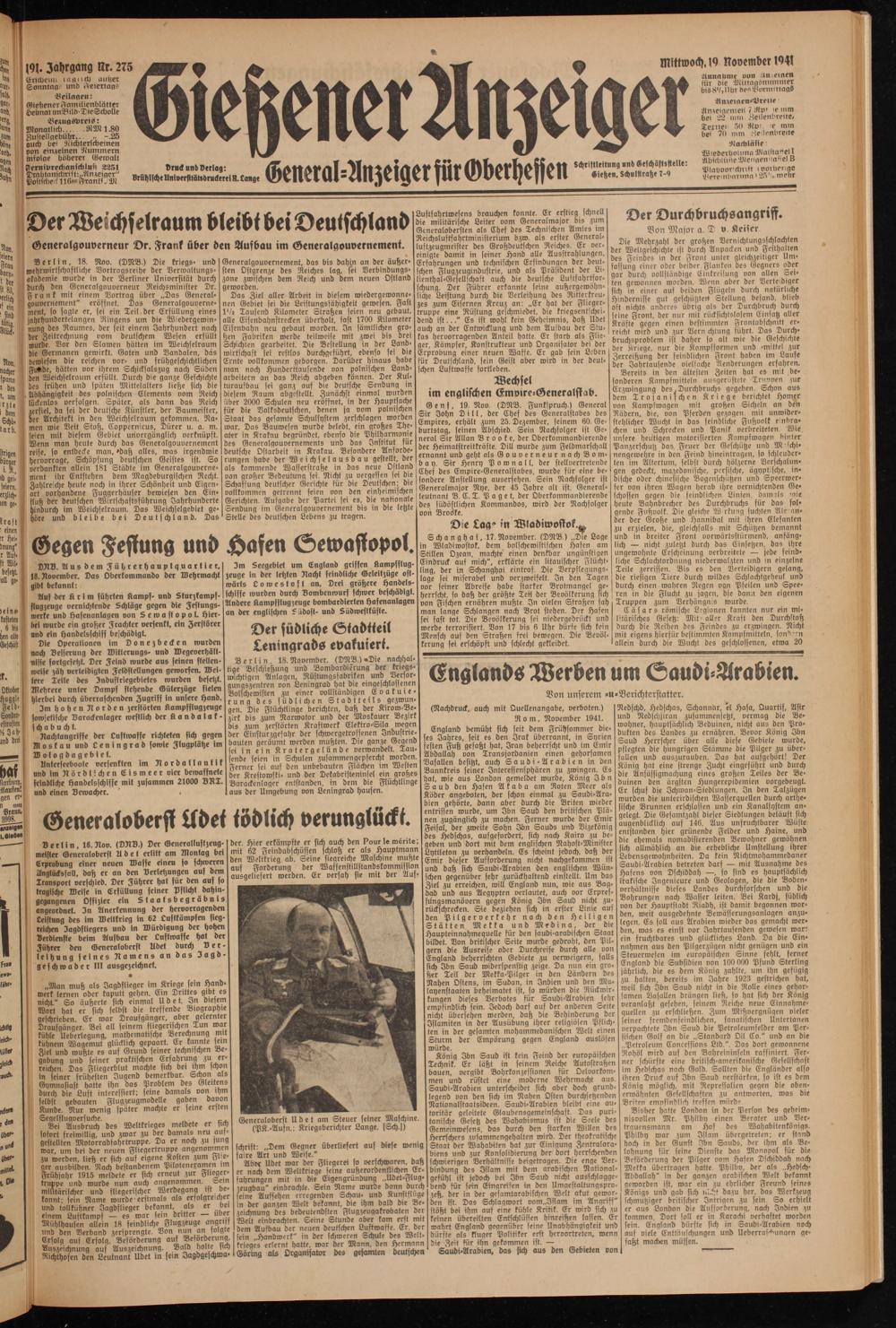 191. Jahrgang Nr. 275 Erscheint laniid) nutzer (Sonntag. und Aeiettag*