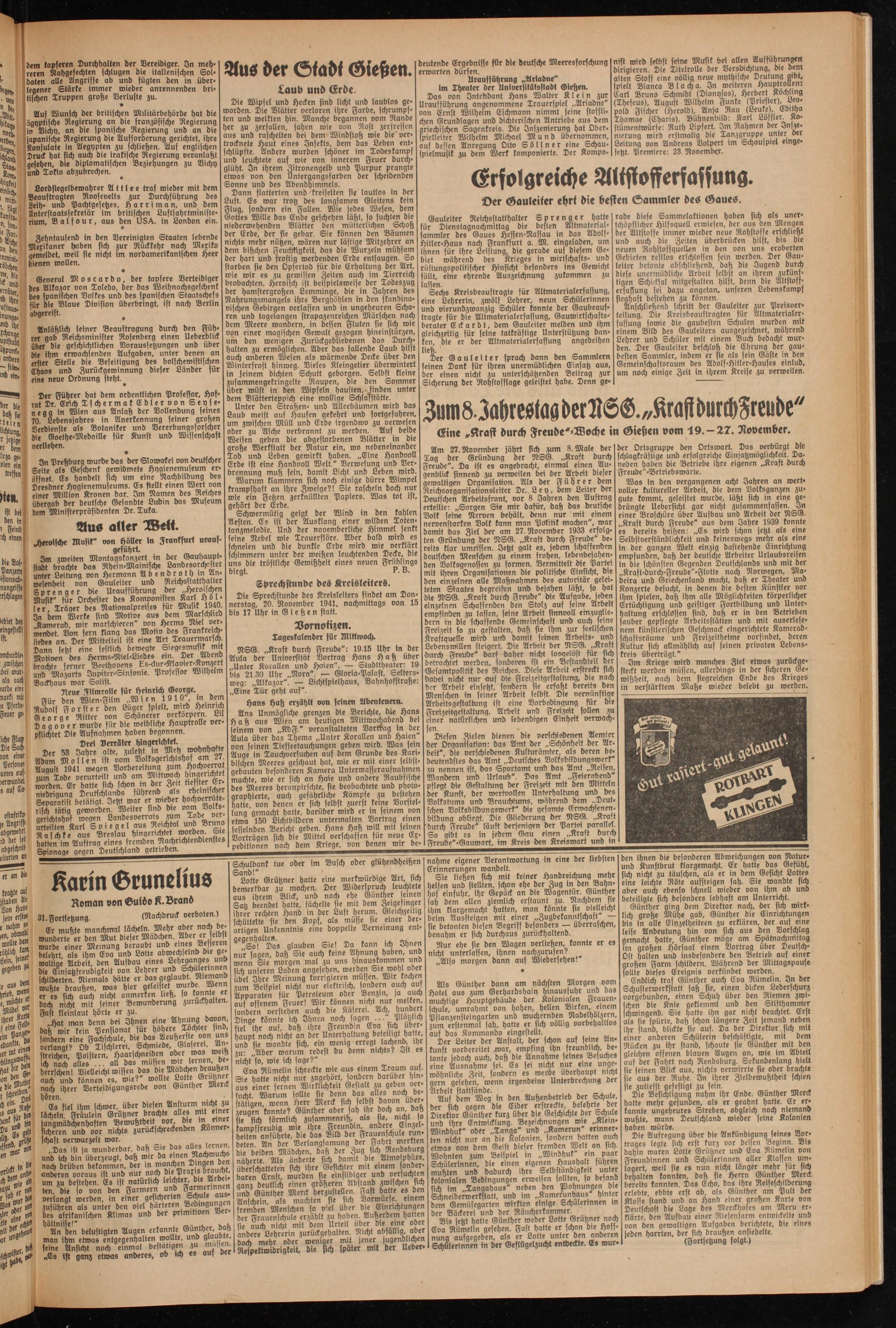 Die Sprechstunde des Kreisletters findet am Donnerstag, 20. November 1941, nachmittags von 15 bis 17 Uhr inGießen statt.