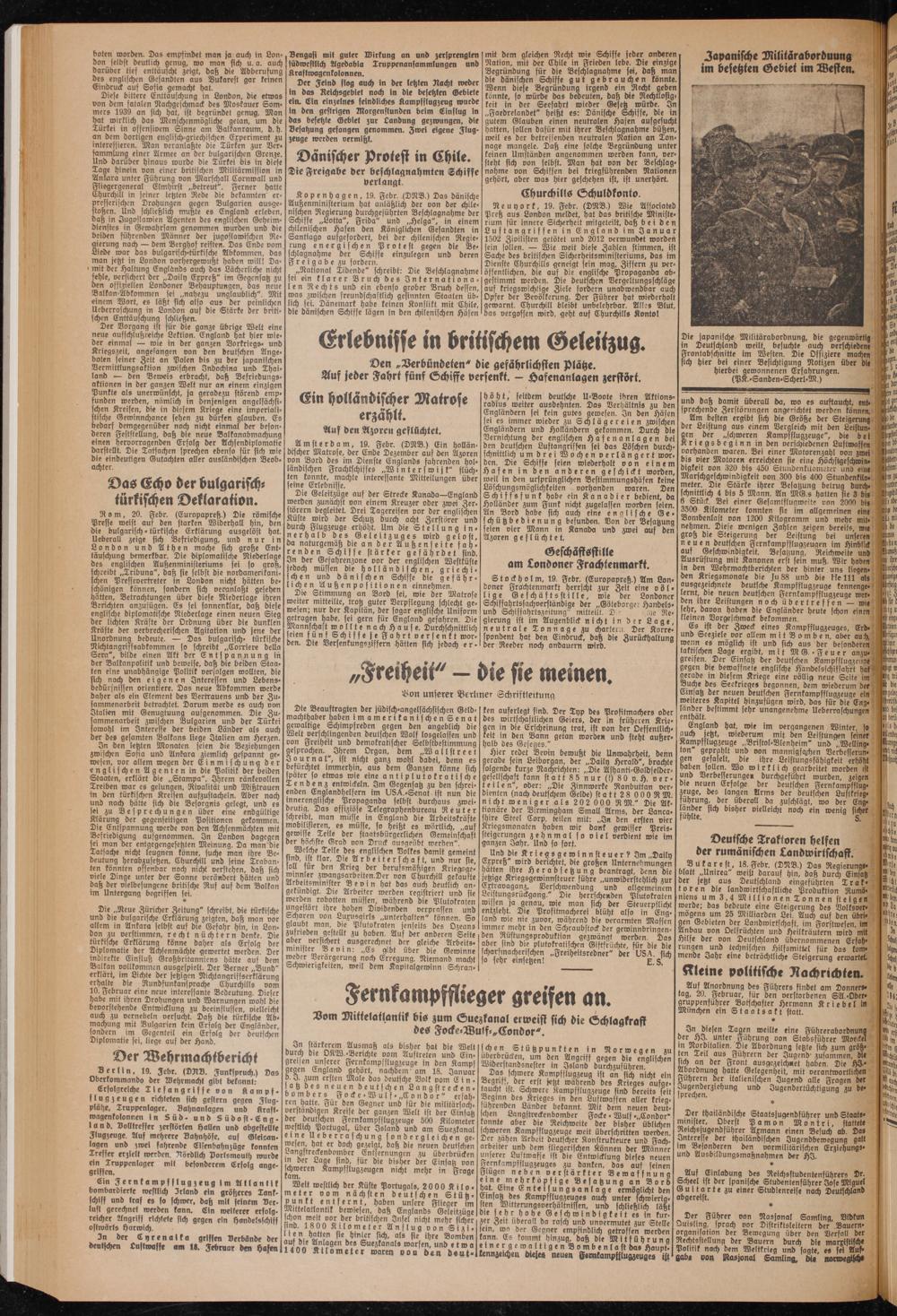 Berlin, 19. Febr. (DNB. Funkspruch.) Das Oberkommando der Wehrmacht gibt bekannt: