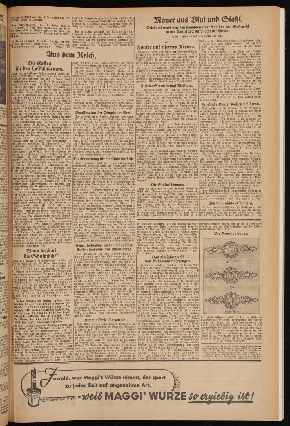Die Frontflugspanye wird in drei verschiedenen Ausführungen verliehen, entsprechend dem Front- einsatz bei Jagd- und Zerstörerverbänden, bei Kampf und Sturzkampf- sowie Transportverbänden und schließlich bei Aufklärunas- und Seenotverbänden. Der Anzahl der durchgeführten Frontflüge entsprechend erfolgt die Verleihung der Frontflugspange ab 20 Frontflügen in Bronze, ab 60 Frontflügen in Silber und ab 110 Frontflügen in Gold. (Scherl-Bilderdienst-M.)